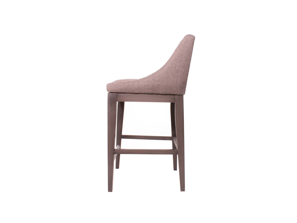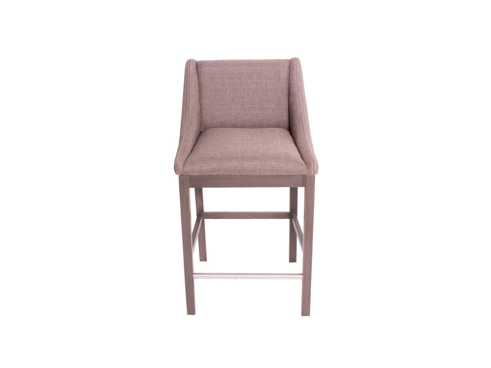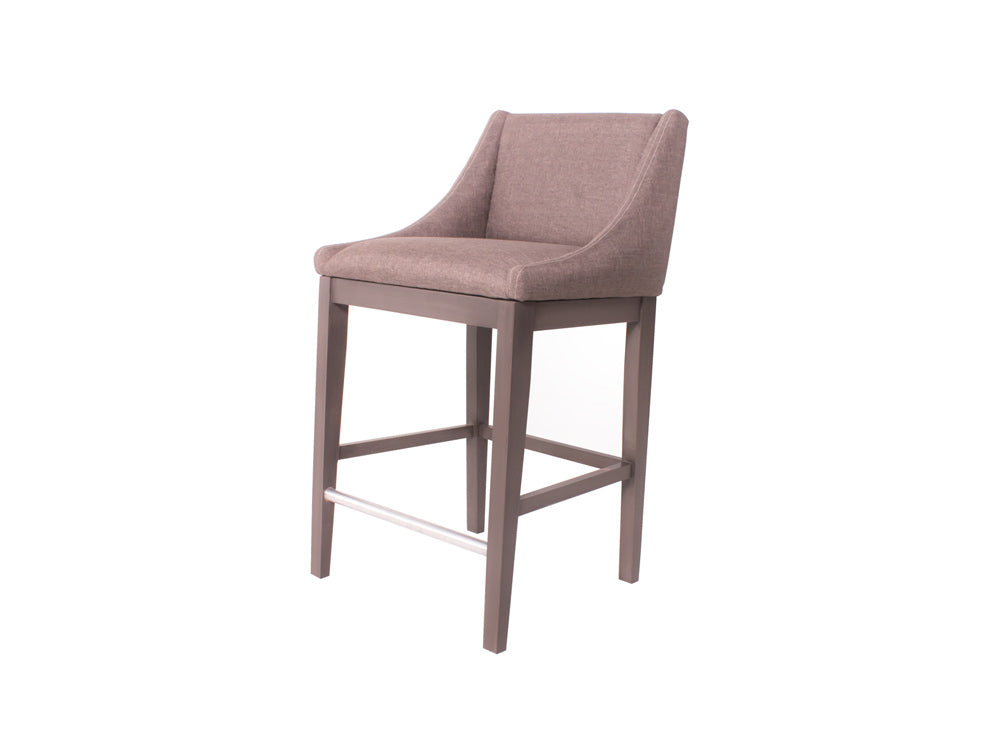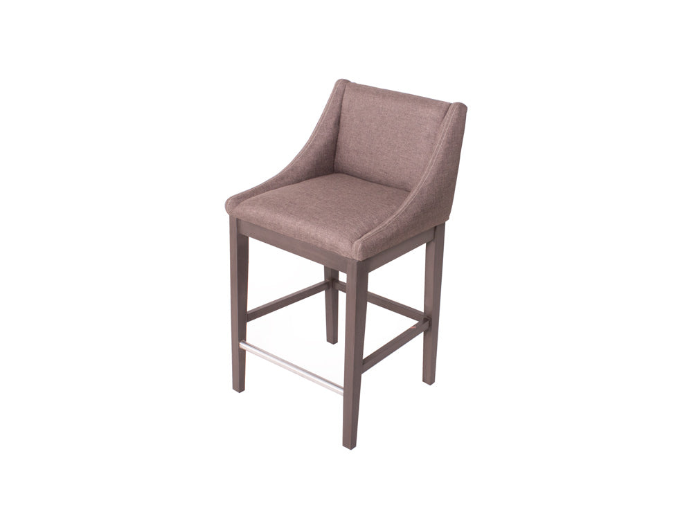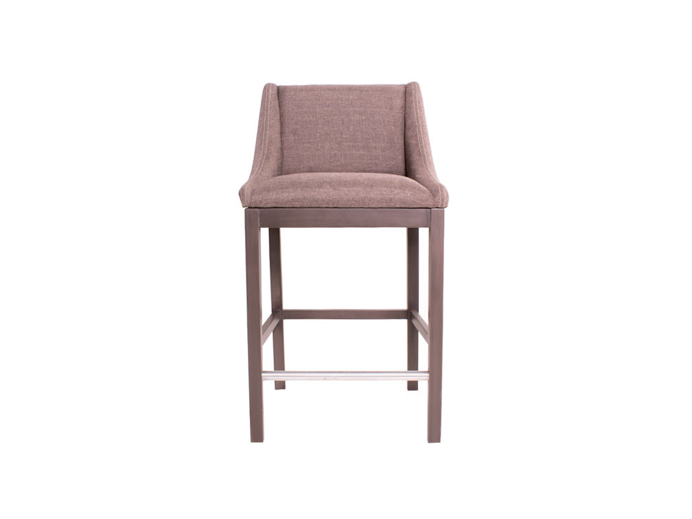 Encontrará este banco alto con la base en color nogal, y el tapiz con la opción en color gris oscuro o beige.