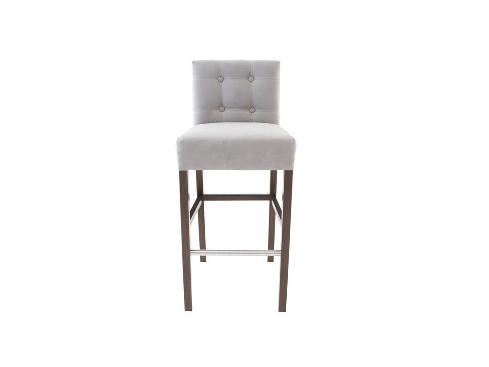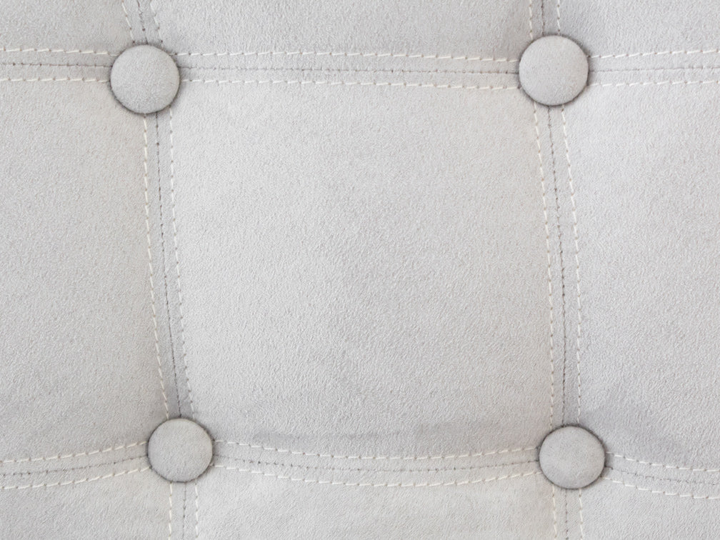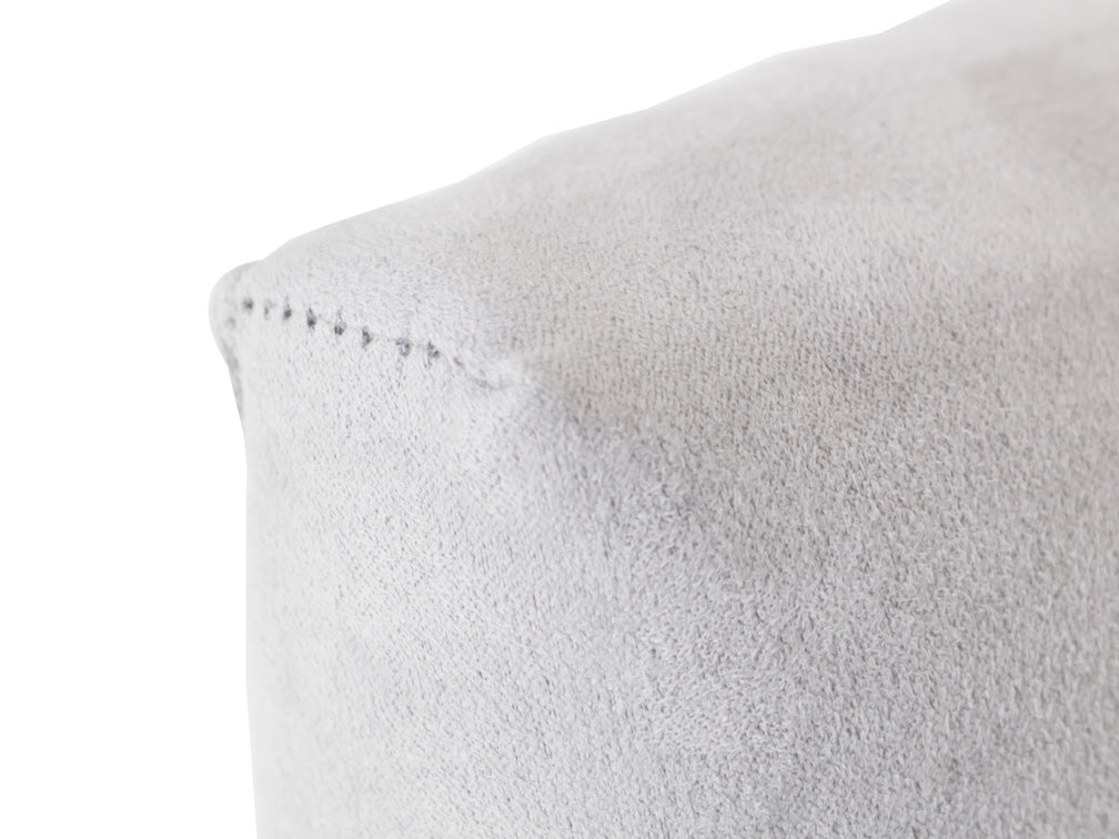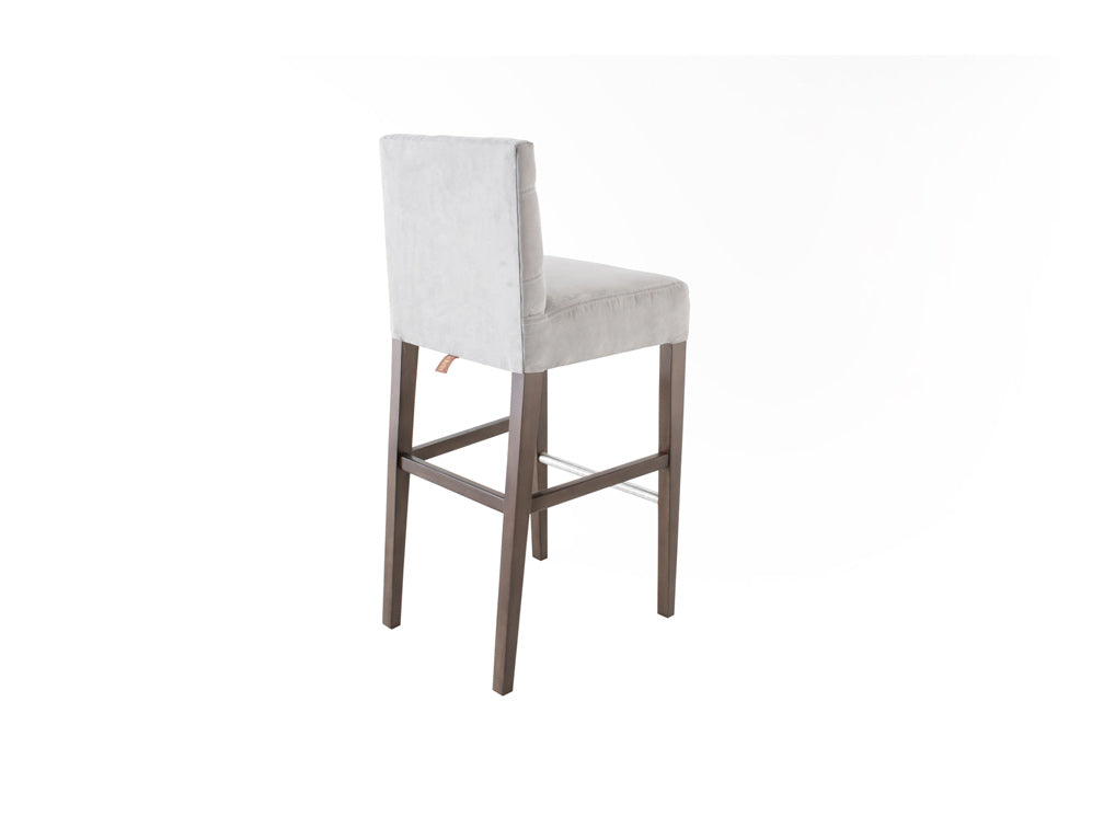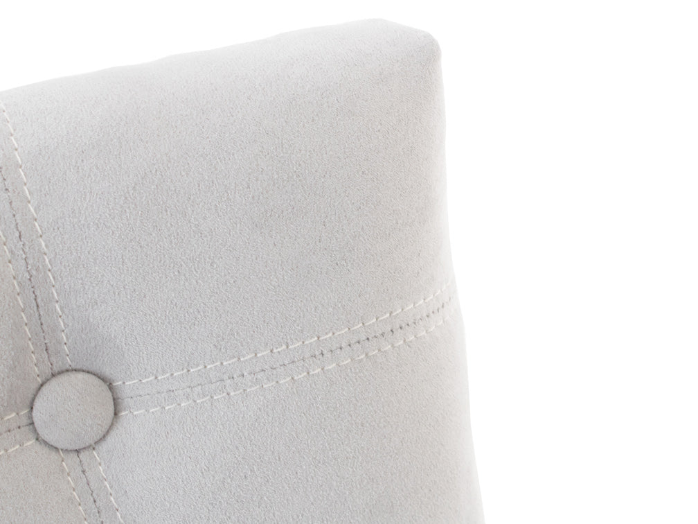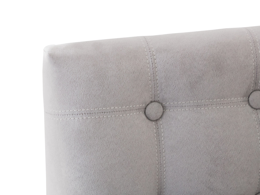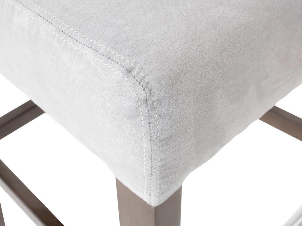 Este banco ilustrado es de suede en color plata, con base de madera de poplar en color nogal y acero rayado.