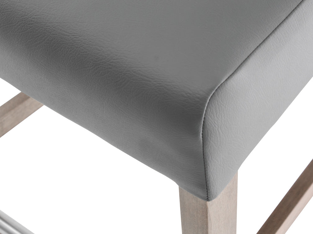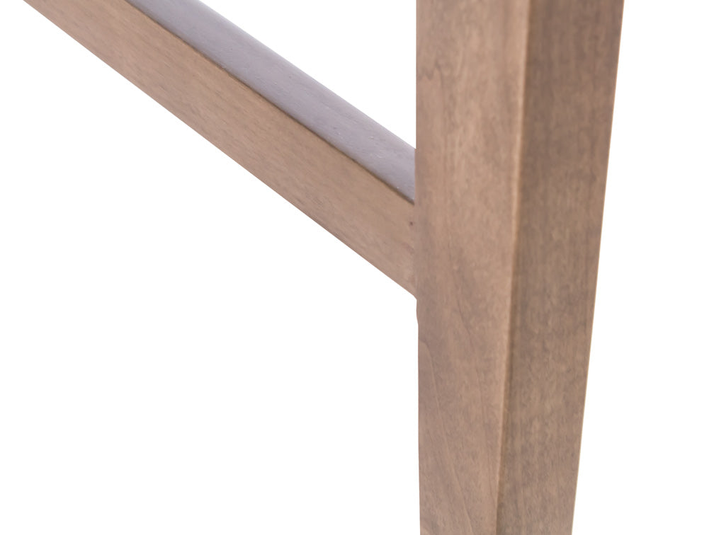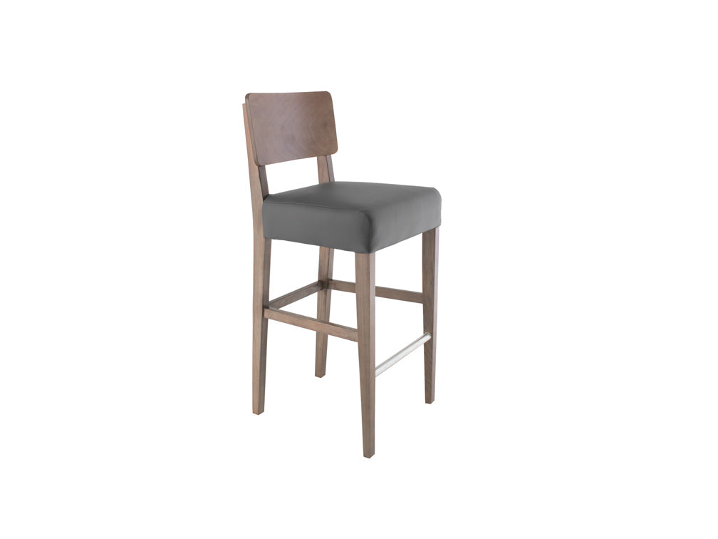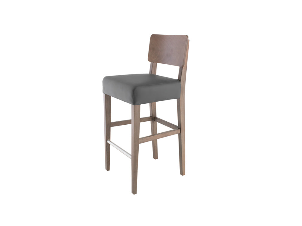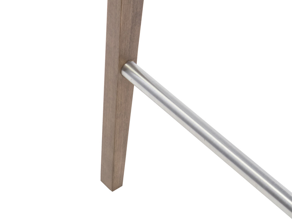 El Banco Alto Moderno Contempo Lazcano ilustrado es de madera de poplar con tapiz Denali Med Grey en color tabaco y descansa pies de aluminio rayado.