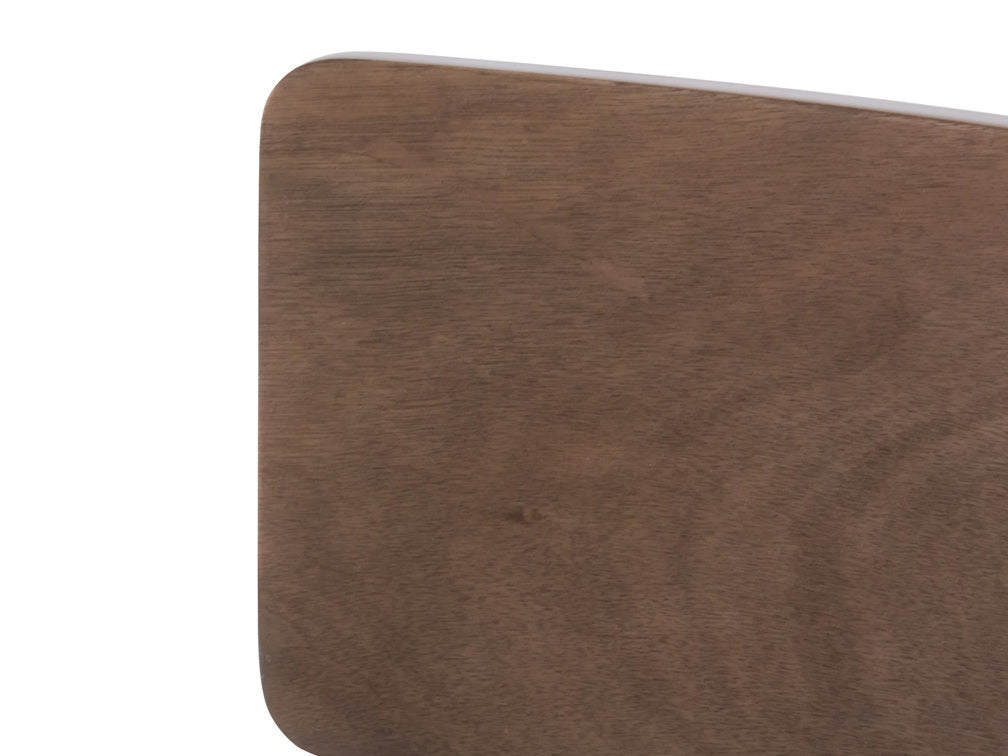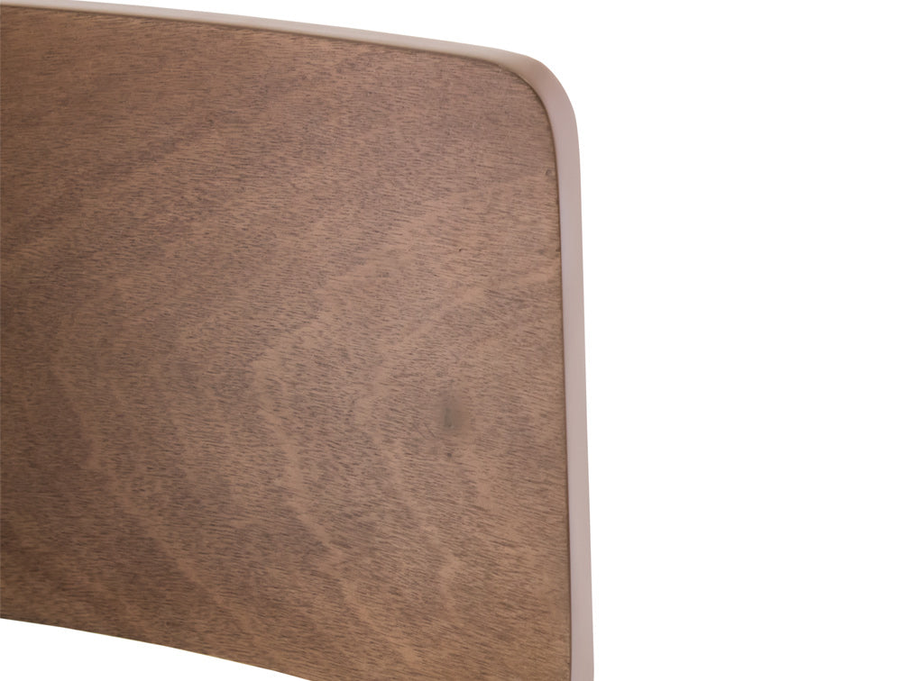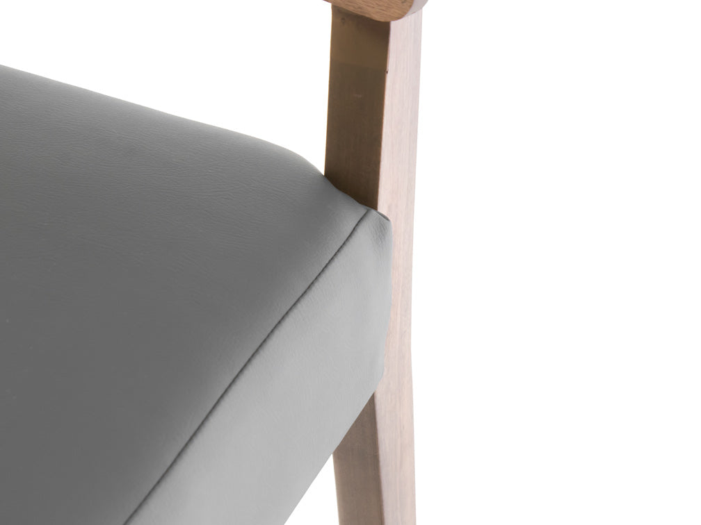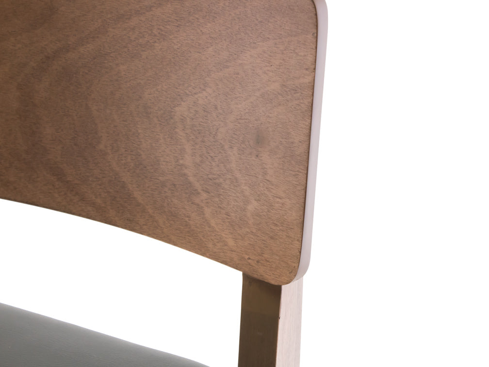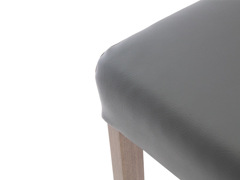 El Banco Alto Moderno Contempo Lazcano ilustrado es de madera de poplar con tapiz Denali Med Grey en color tabaco y descansa pies de aluminio rayado.