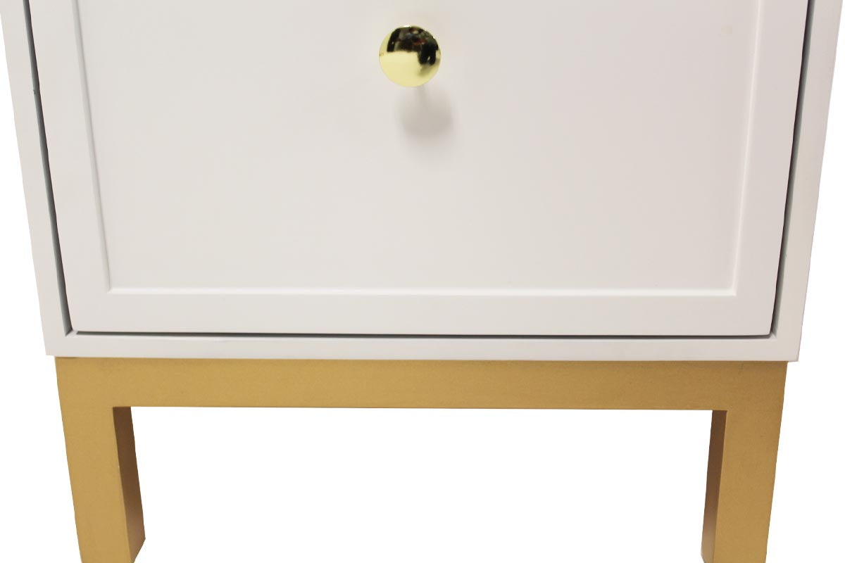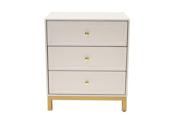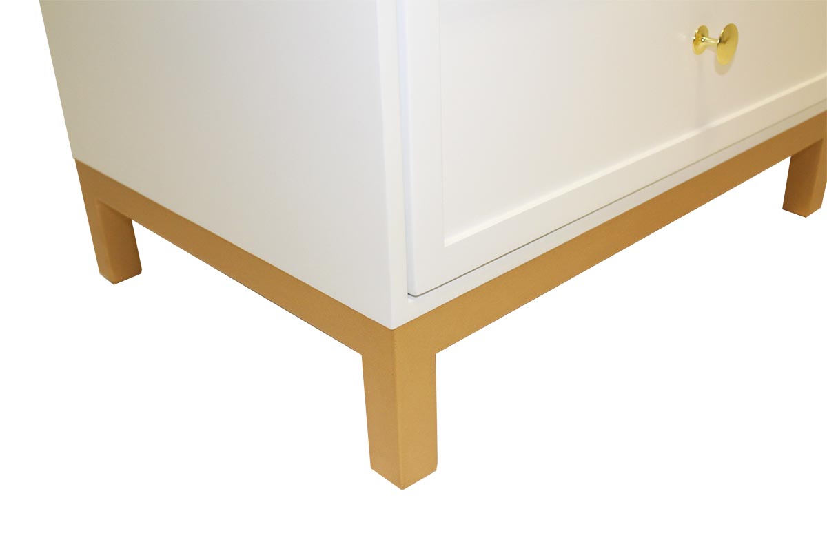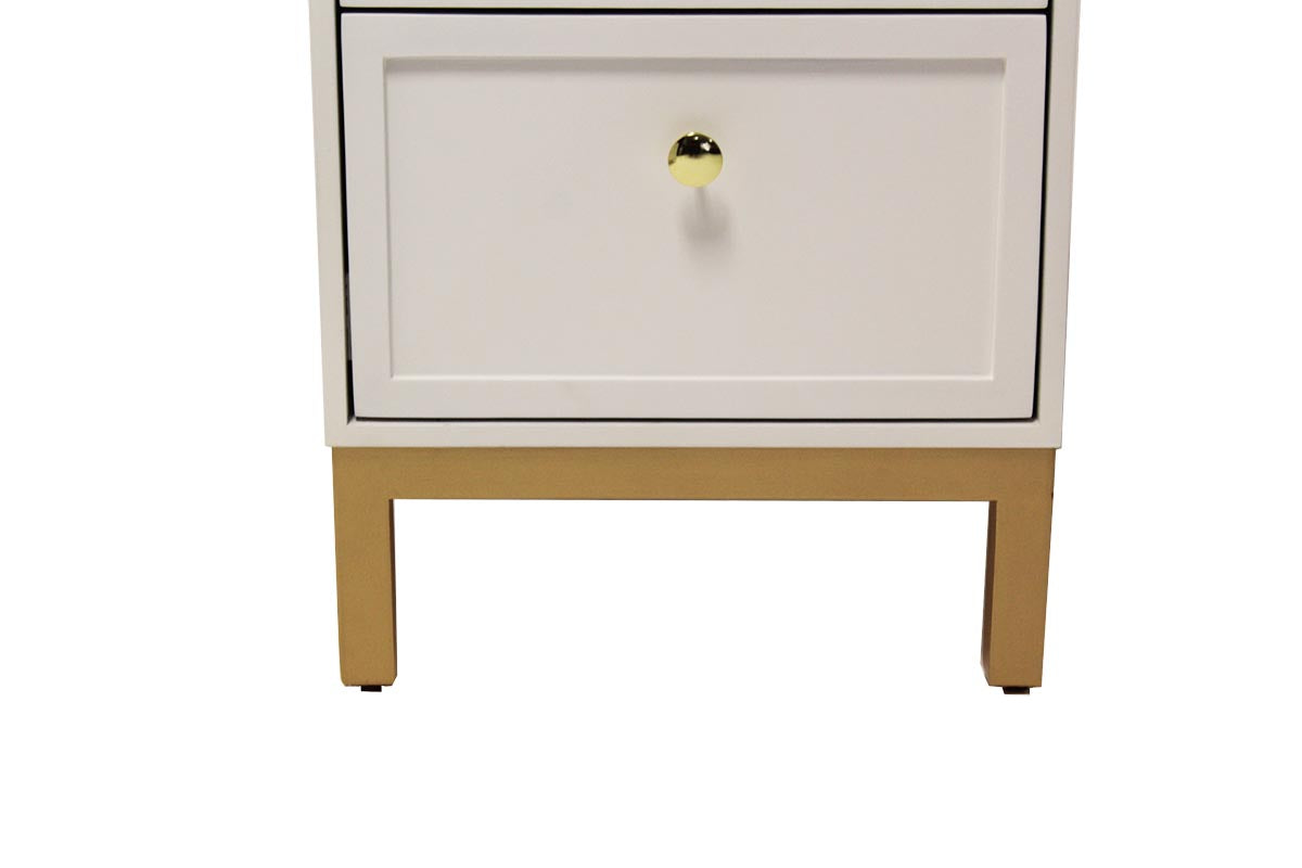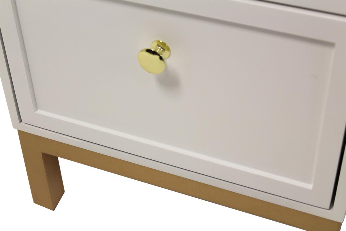 Buró Kontempo New Yorkes el mueble con unos detalles muy limpios en su diseño las patas de madera que están pintadas con color dorado, con un botón en cada cajón como se muestra en la imagen.