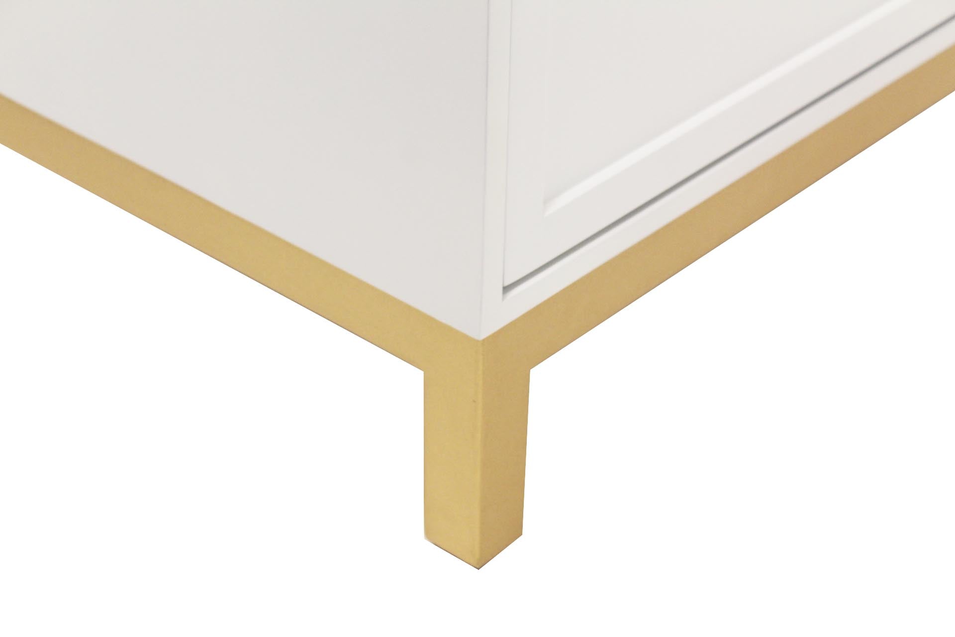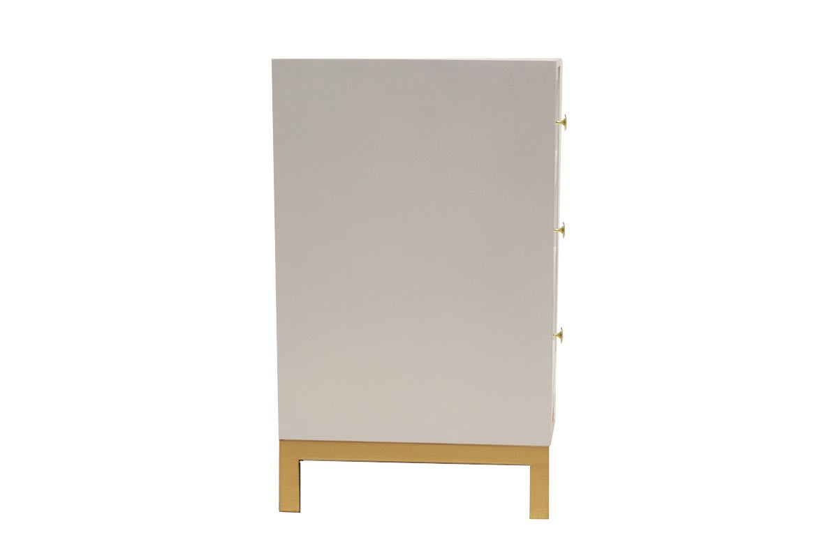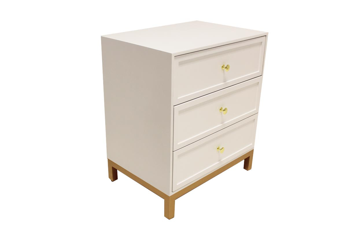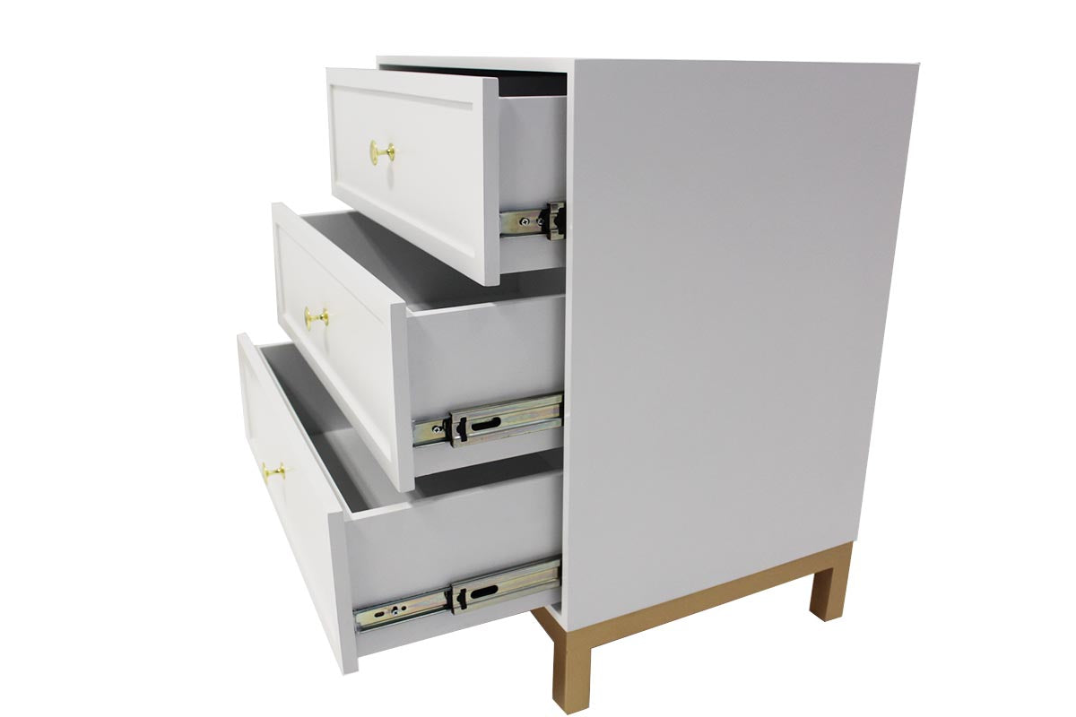 Buró Kontempo New Yorkes el mueble con unos detalles muy limpios en su diseño las patas de madera que están pintadas con color dorado, con un botón en cada cajón como se muestra en la imagen.