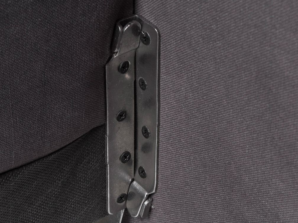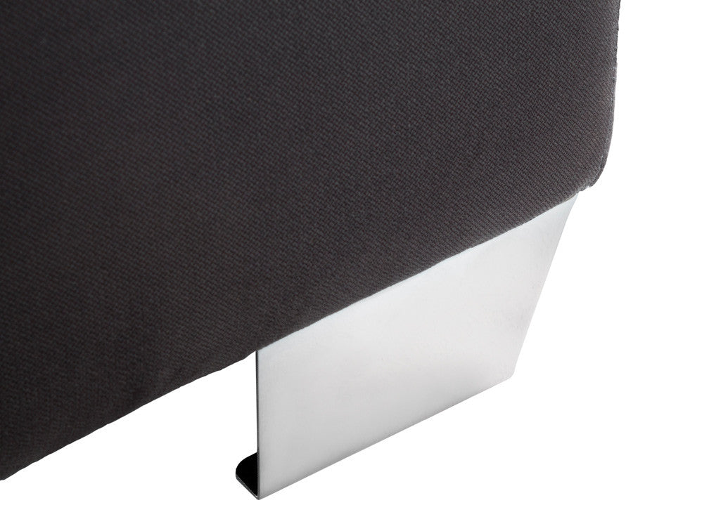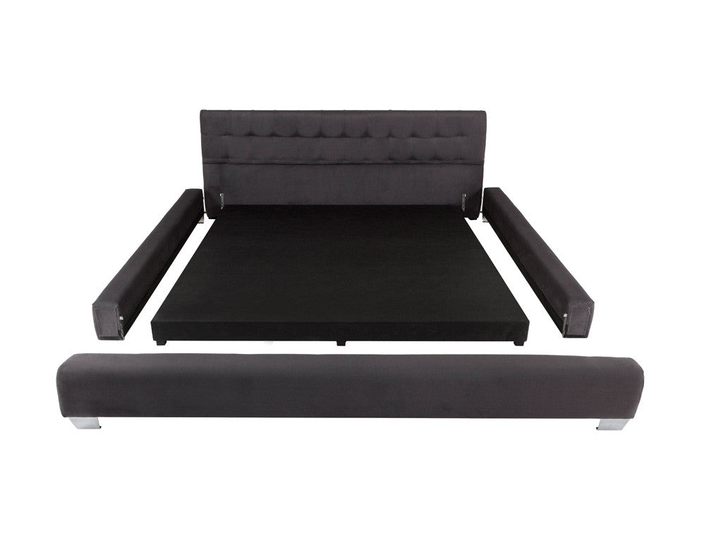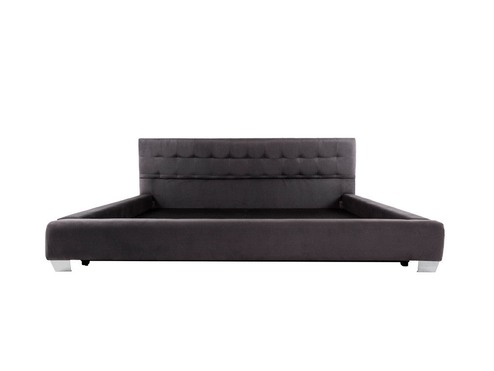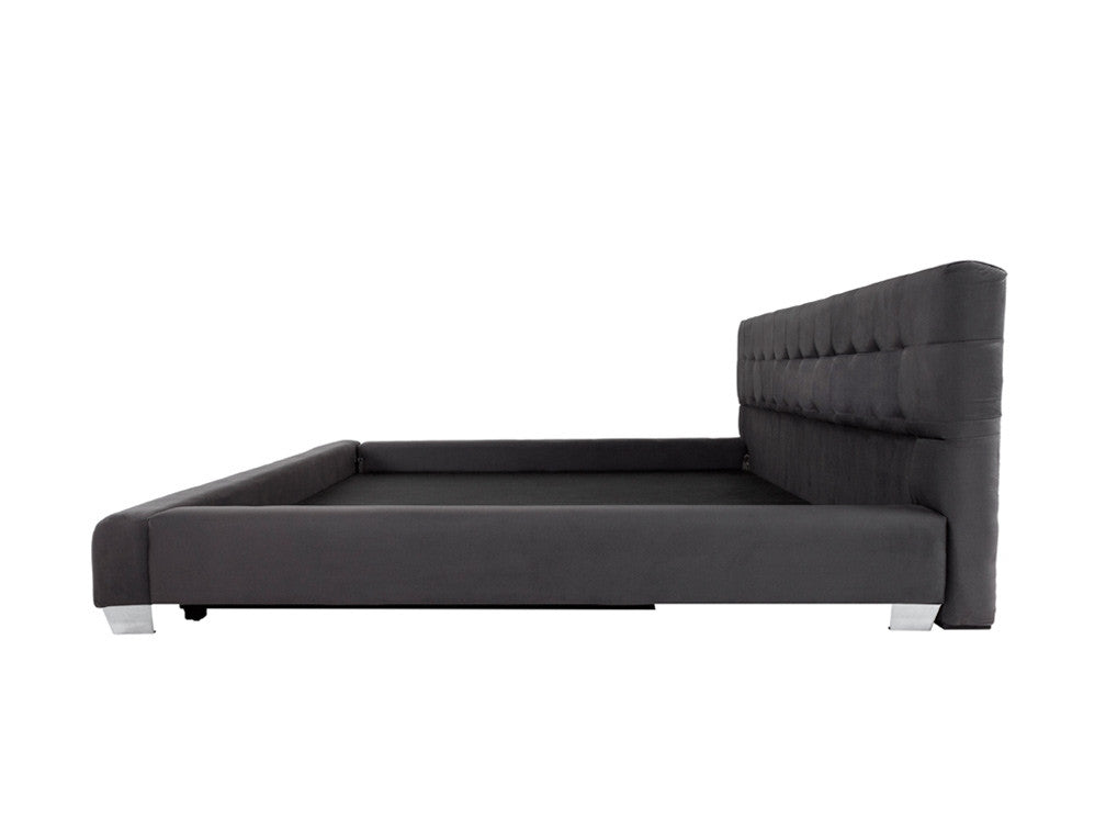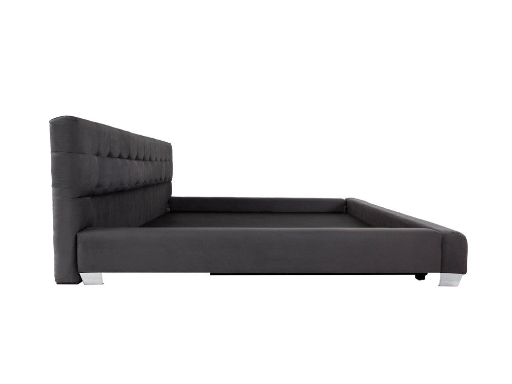 La Cama Contemporánea Kontempo Rubí ilustrada es de madera de mdf con tapiz de tela en color gris Oxford y patas en acero cromado.