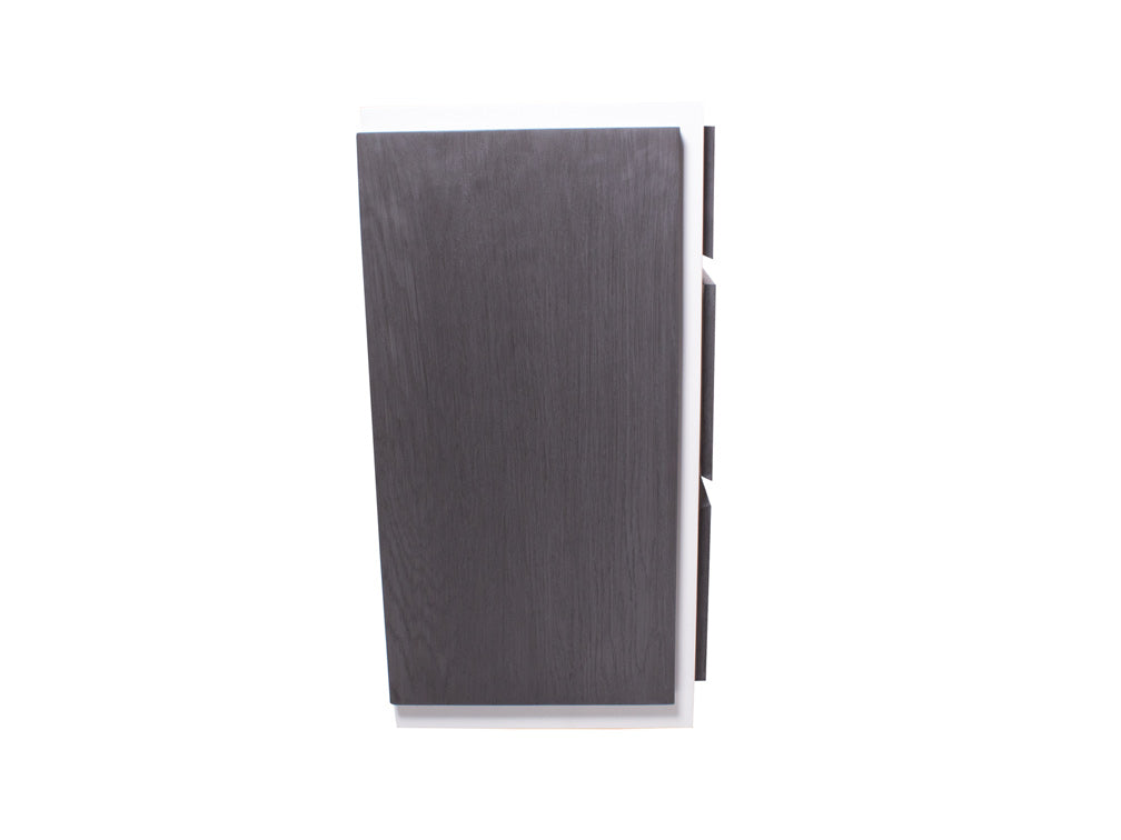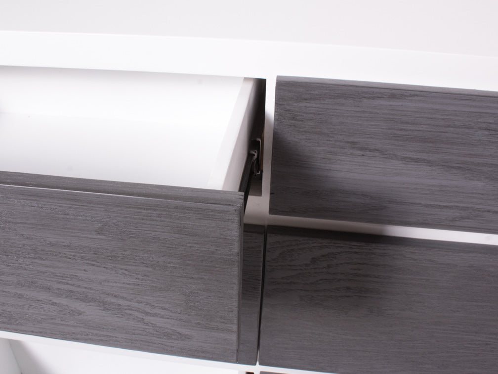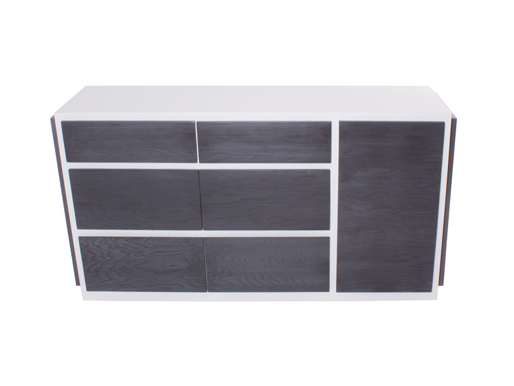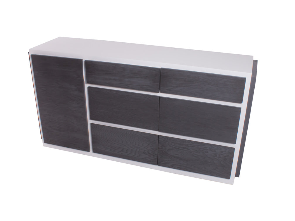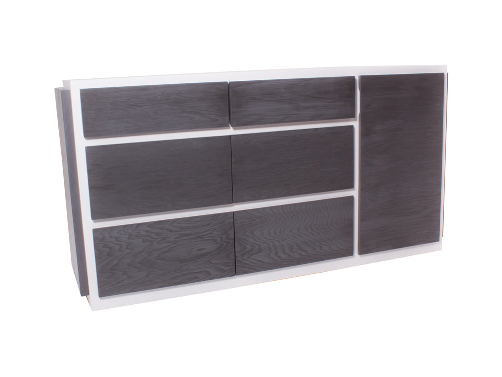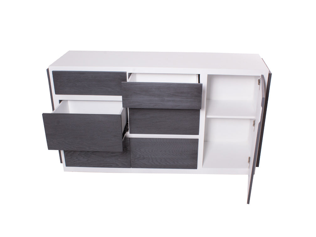 La Cómoda Moderna Kontempo CR-70 ilustrada es de madera de mdf con enchapado de encino liso en color gris con blanco.