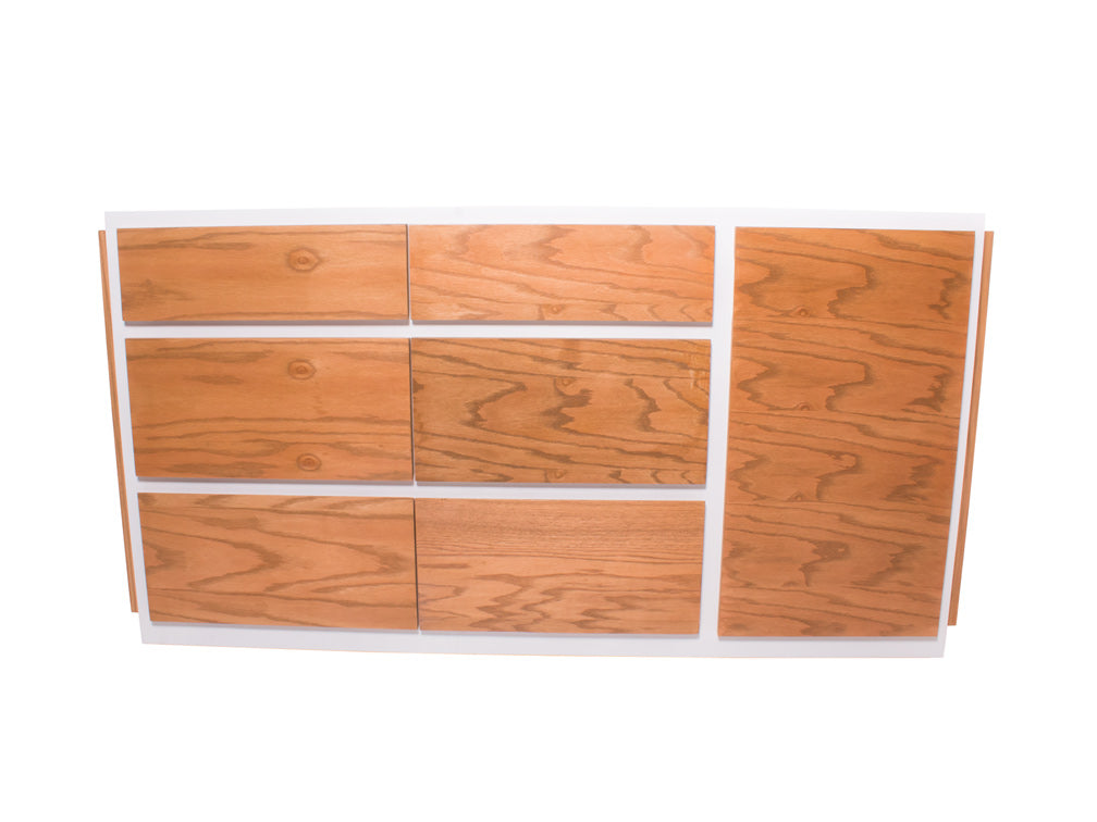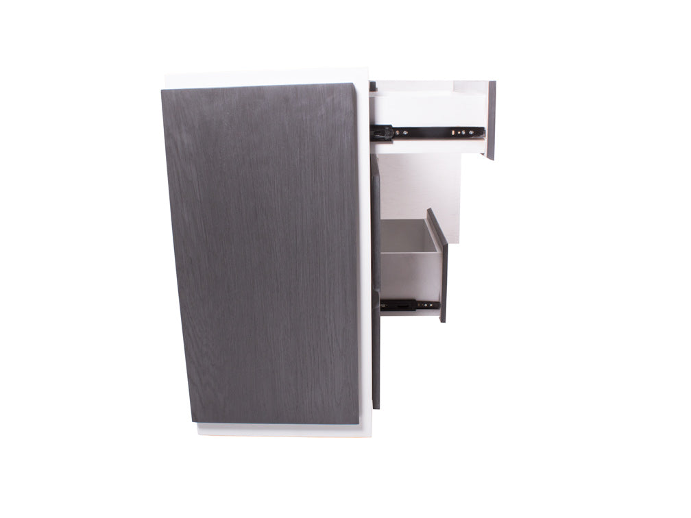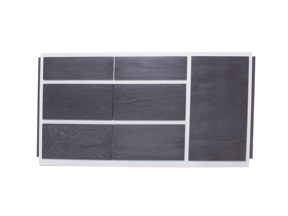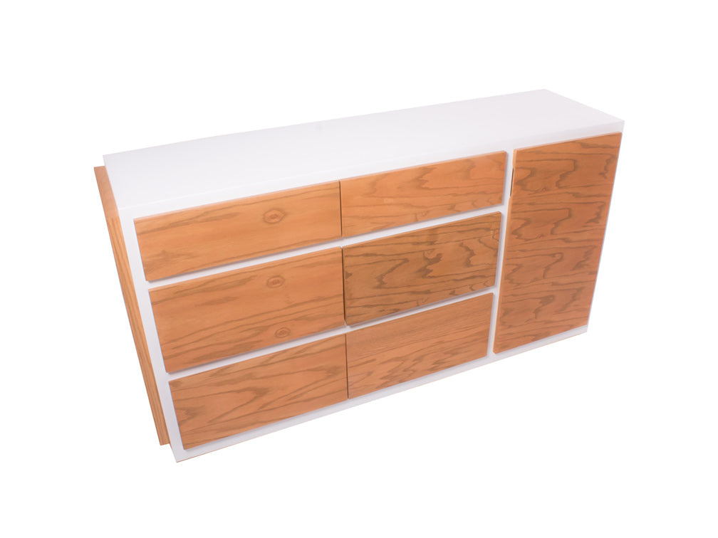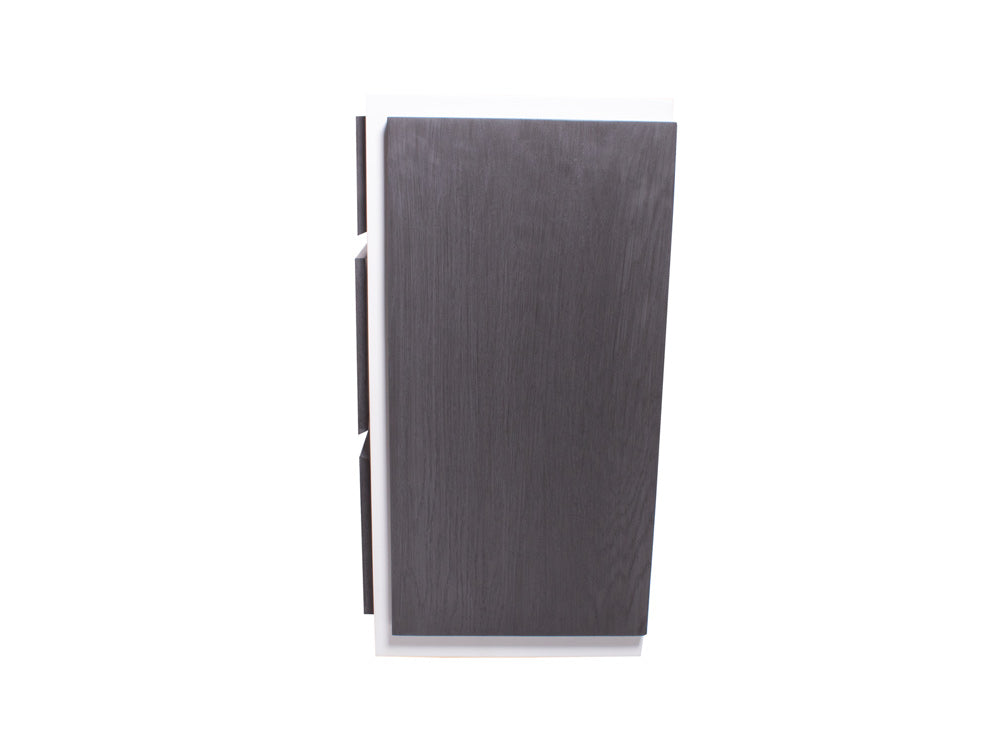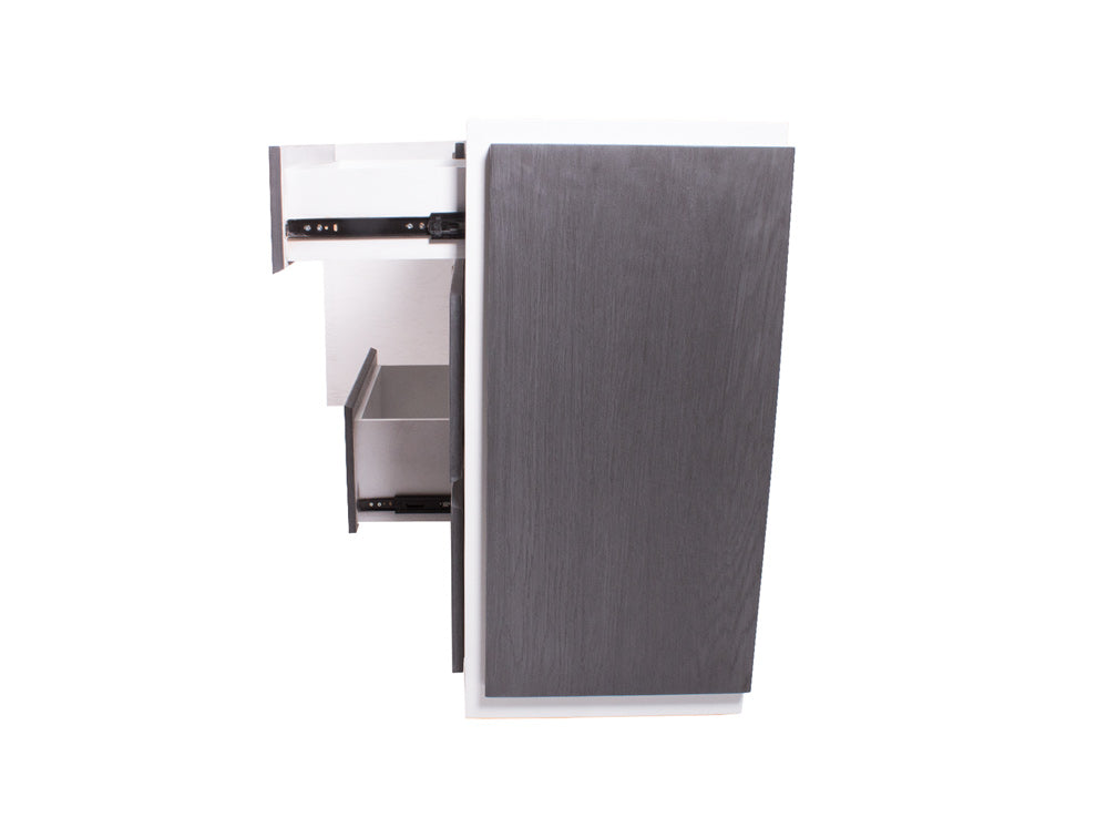 La Cómoda Moderna Kontempo CR-70 ilustrada es de madera de mdf con enchapado de encino liso en color gris con blanco.