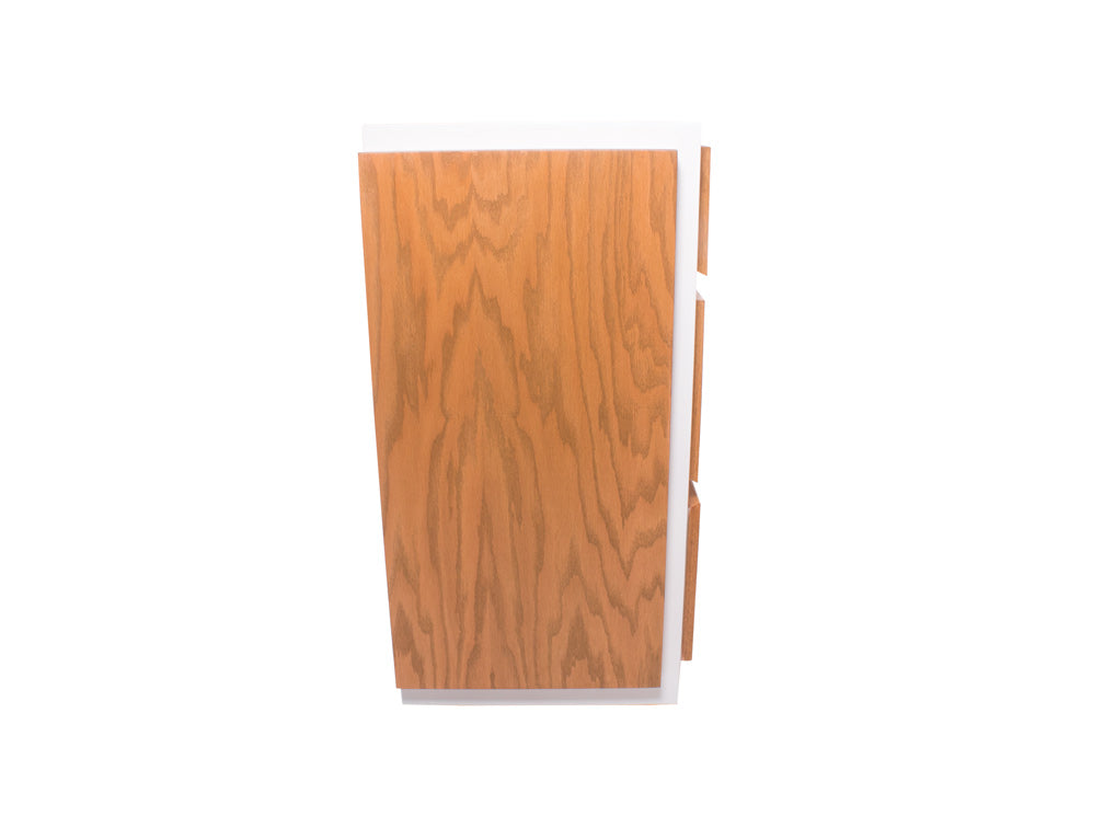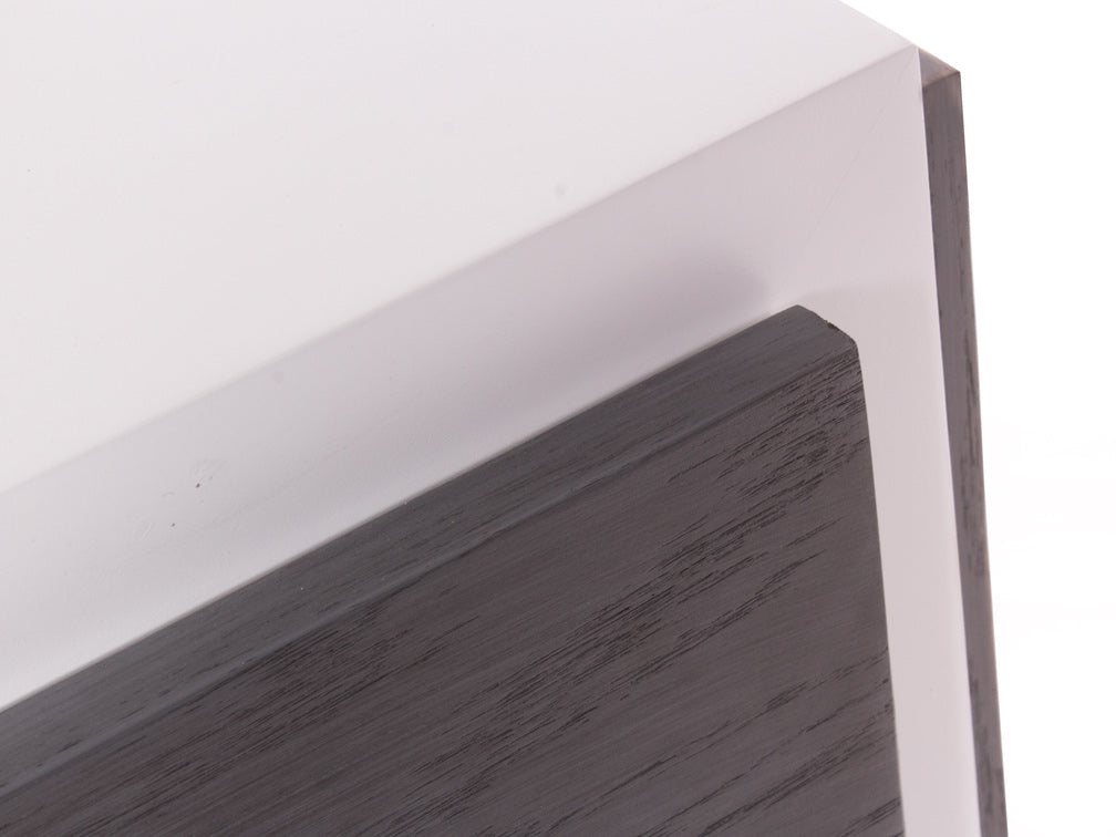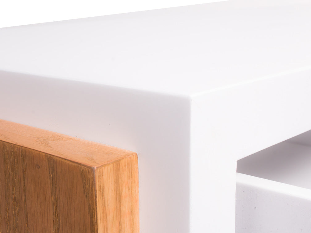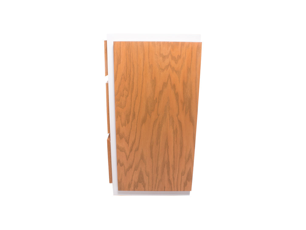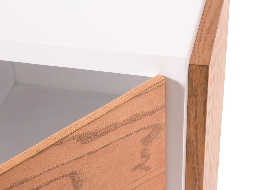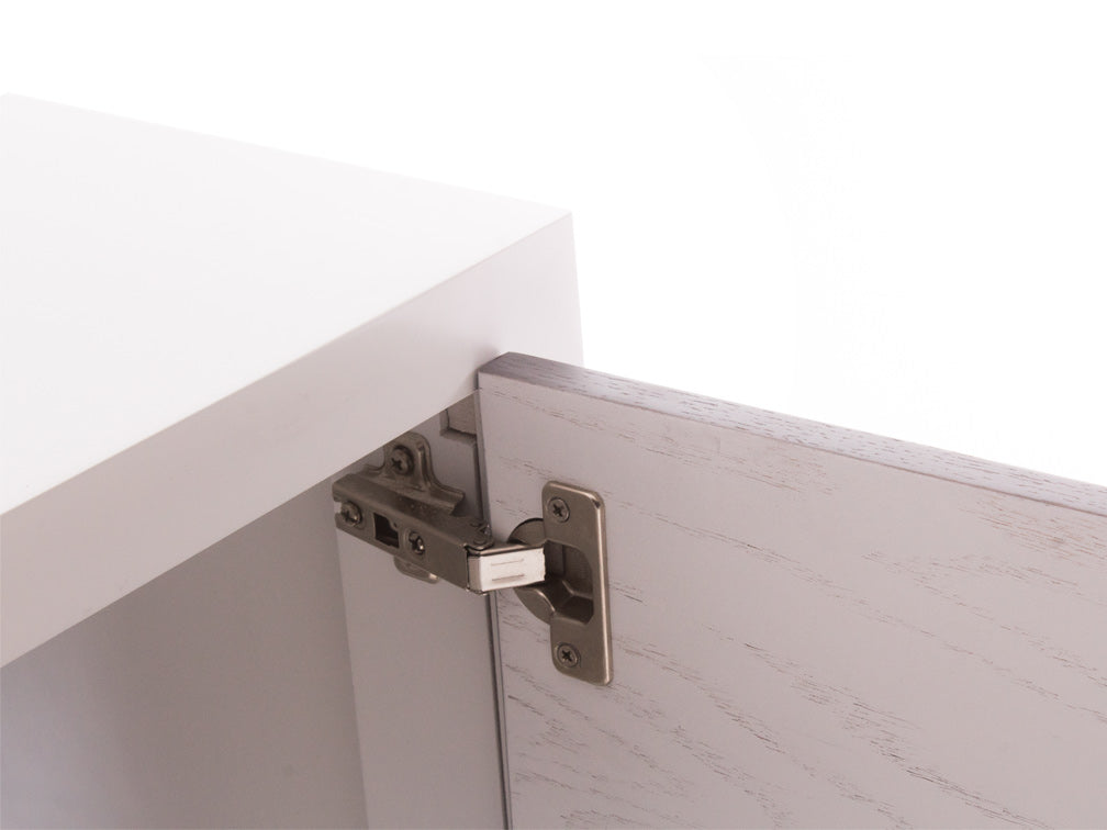 La Cómoda Moderna Kontempo CR-70 ilustrada es de madera de mdf con enchapado de encino liso en color gris con blanco.