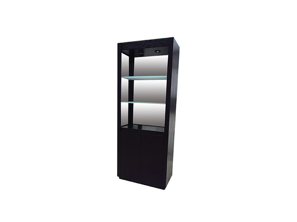 La Contrabarra Kontempo 1 ilustrada es de madera de mdf con enchapado de encino en color chocolate y entrepaños de cristal.
