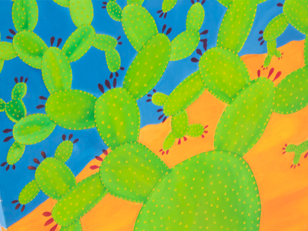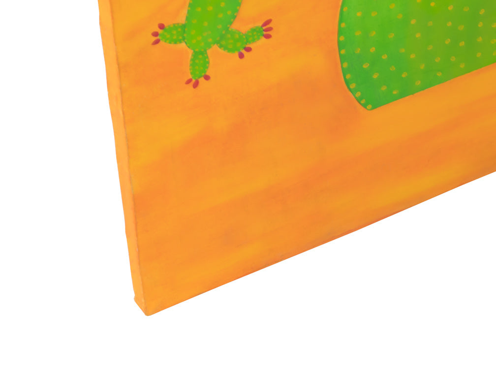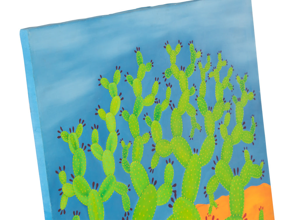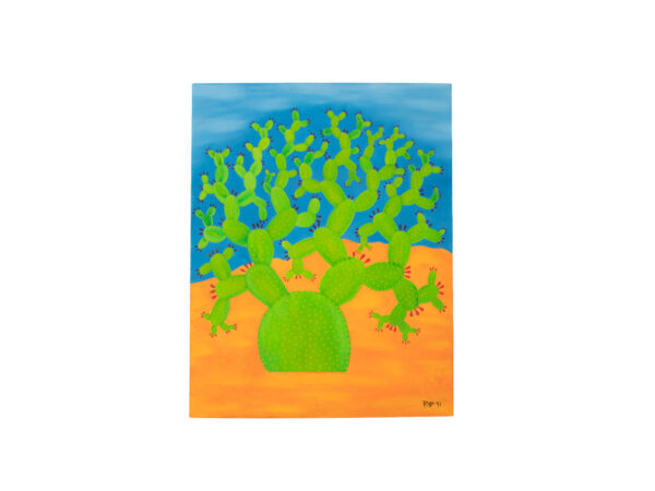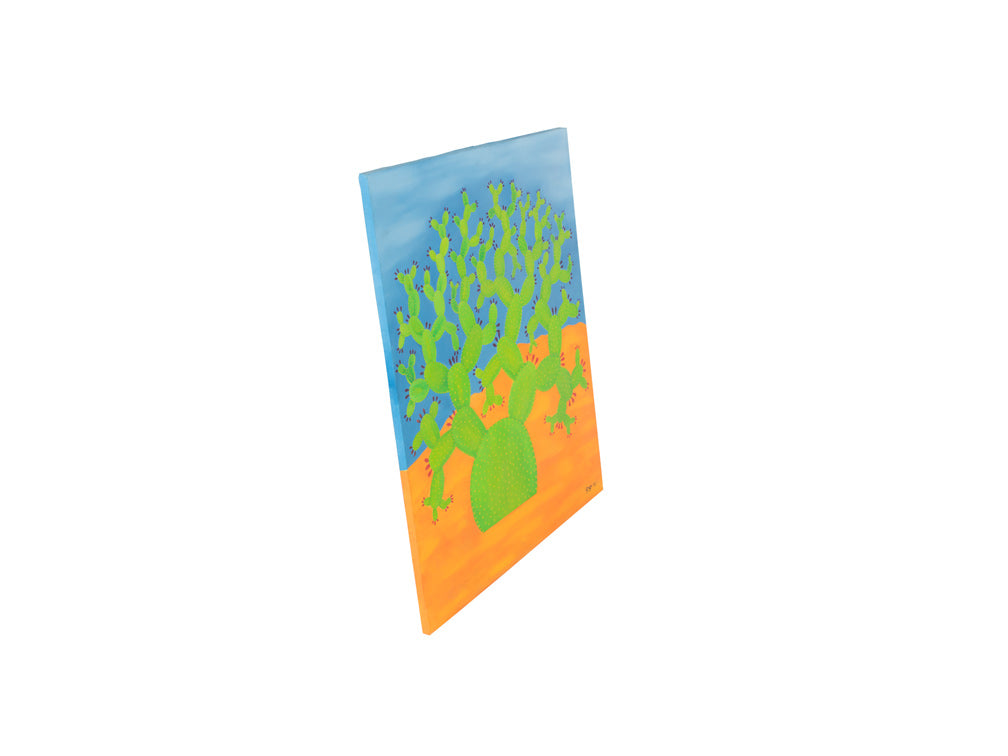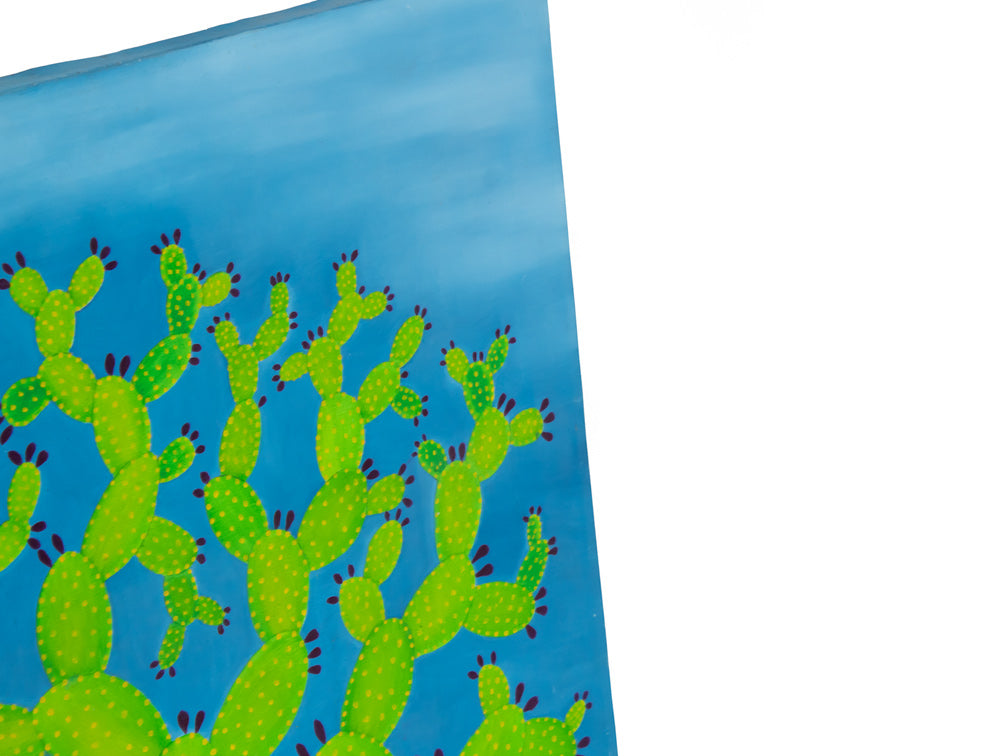 Este hermoso cuadro plasma un hermoso nopal en un vibrante color verde con un tranquilo cielo azul y nubes blancas.