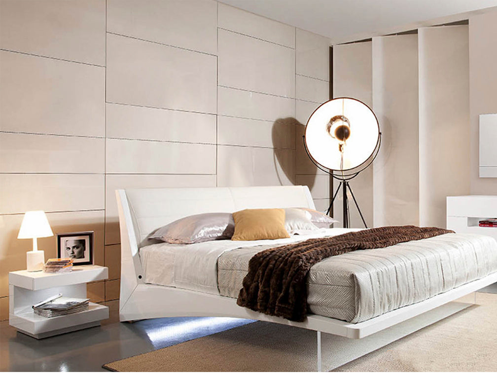 Incluye Cama, y ​​2 Mesas de Noche, Todo en Blanco Mate. Respaldo tapizado en vinil color blanco.