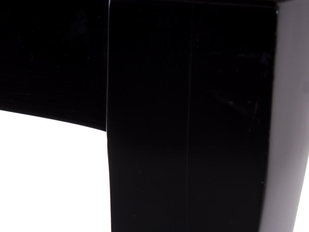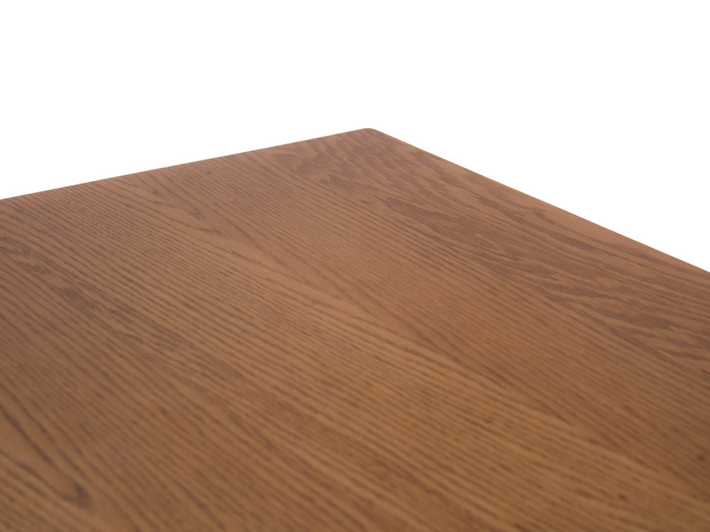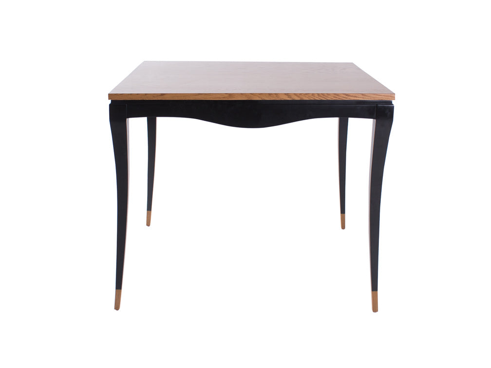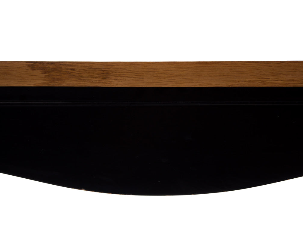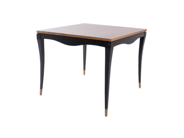La cubierta de la mesa tiene un diseño de curva que la hace resaltar. Y en la base de las patas hace un contraste de color.