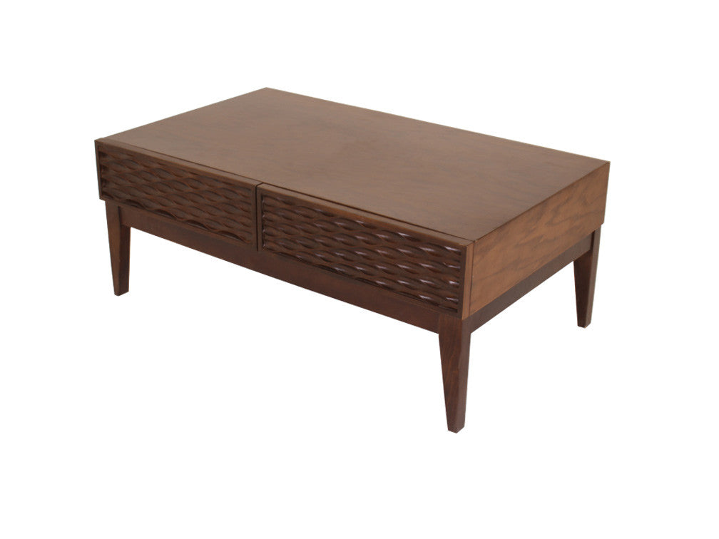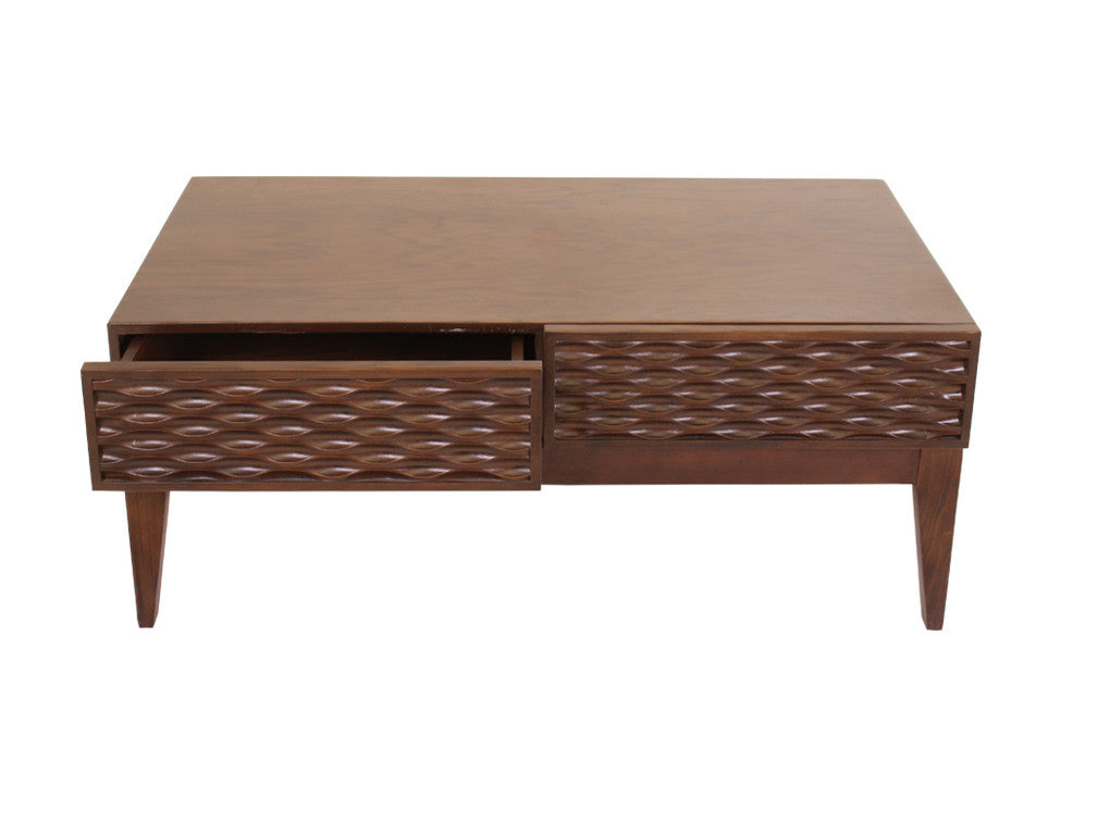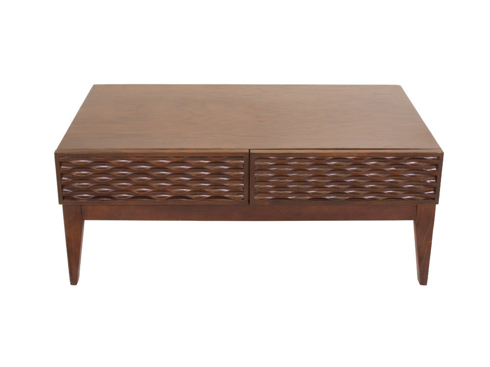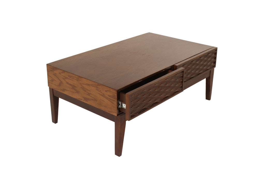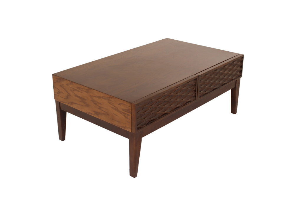 Mesa de centro moderna con diseño de relieve en poliuretano. Fabricada en MDF con enchapado de encino y madera poplar.