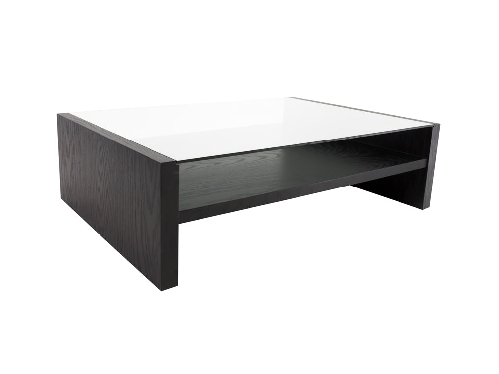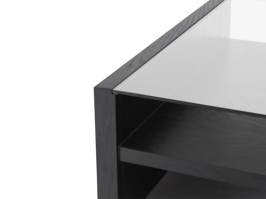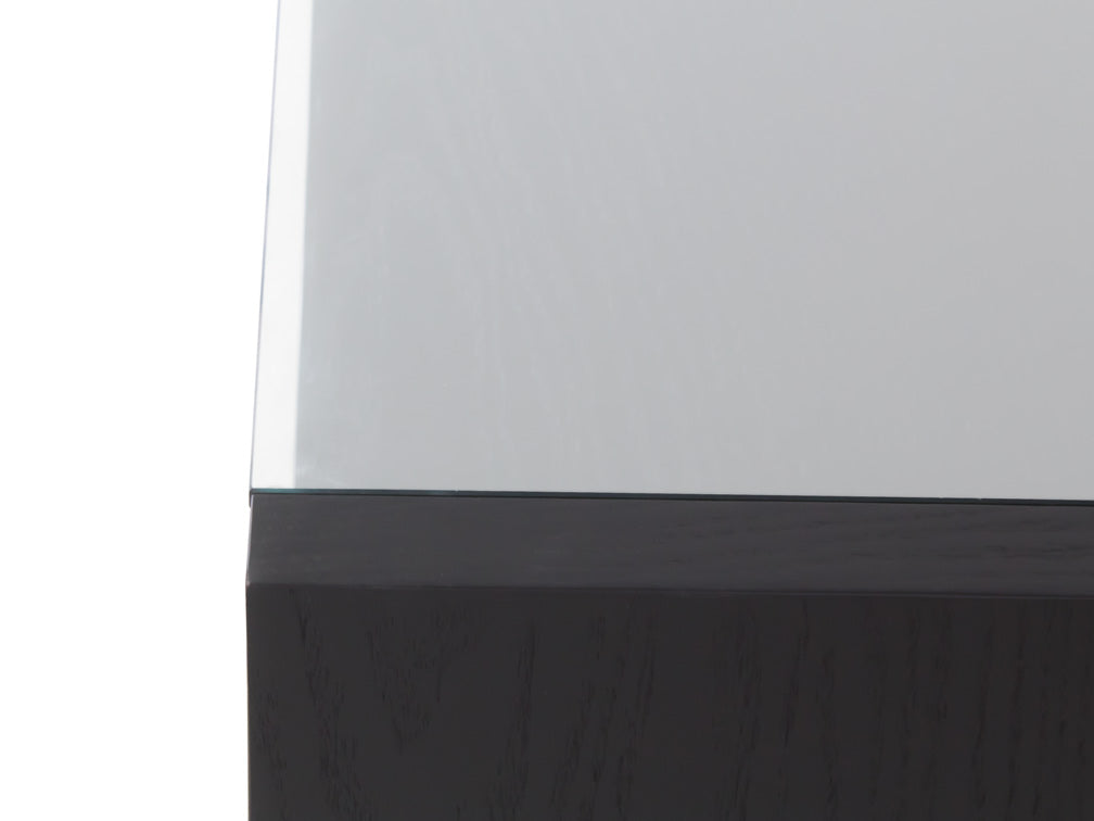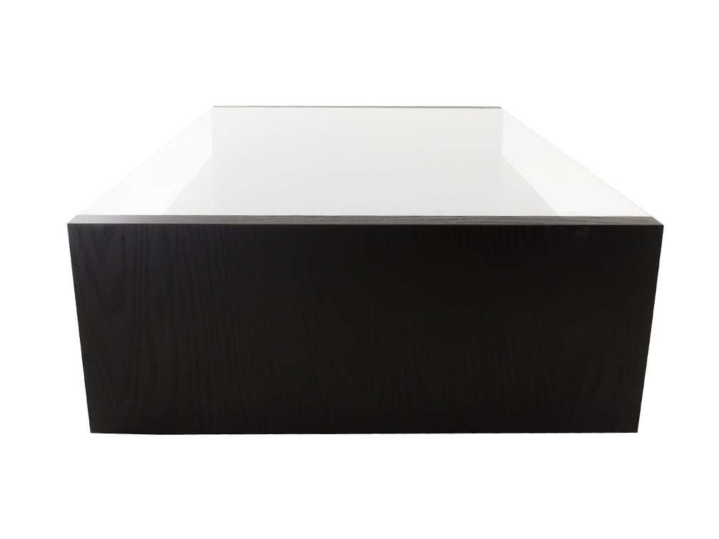 La mesa de centro Kontempo Musta ilustrada es de madera de mdf con enchapado de encino color negro y cubierta de cristal 9 mm con canto pulido brillante.