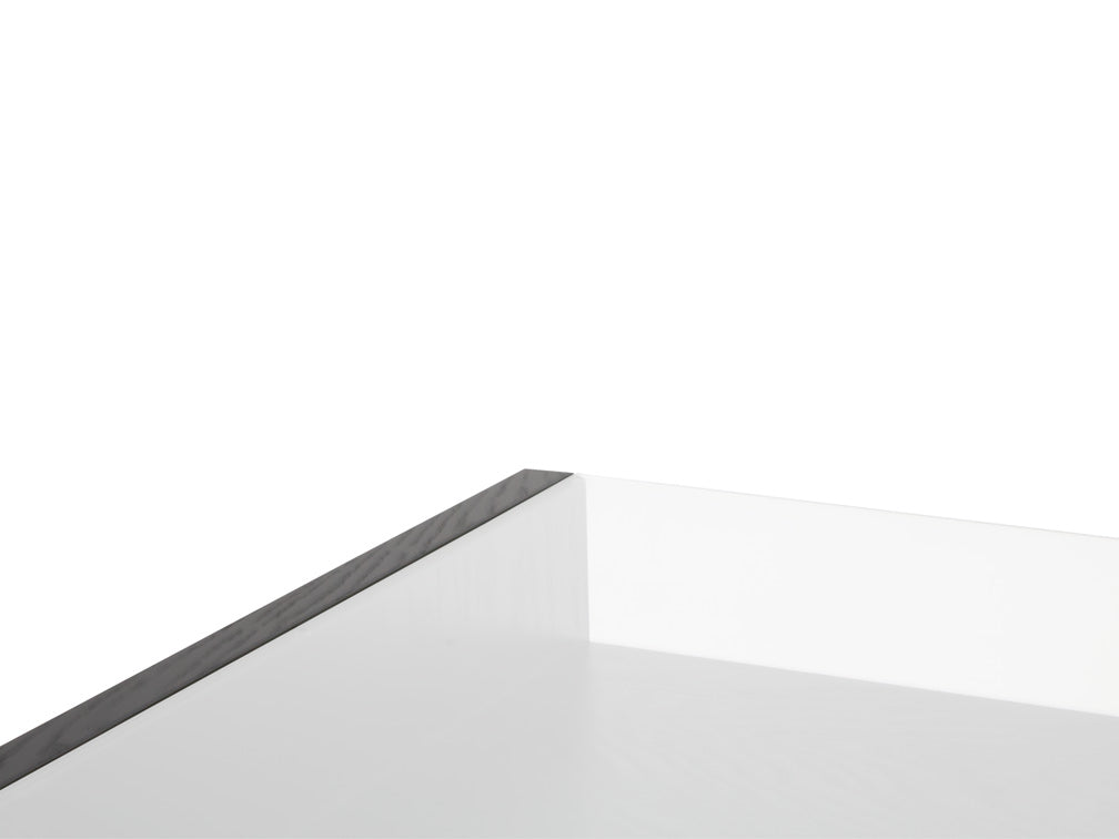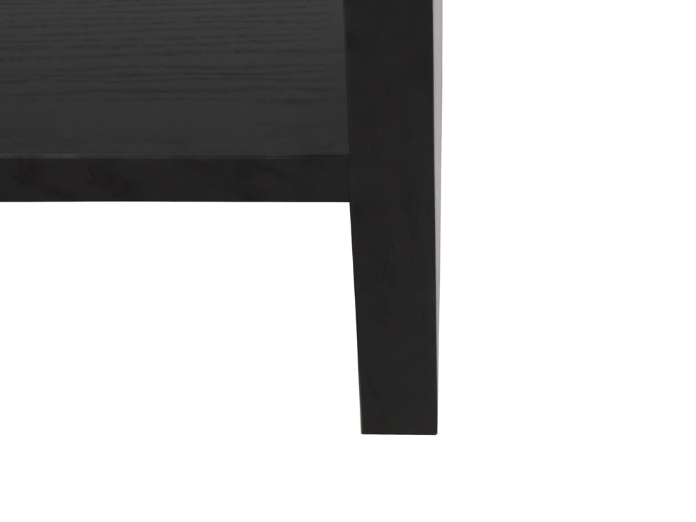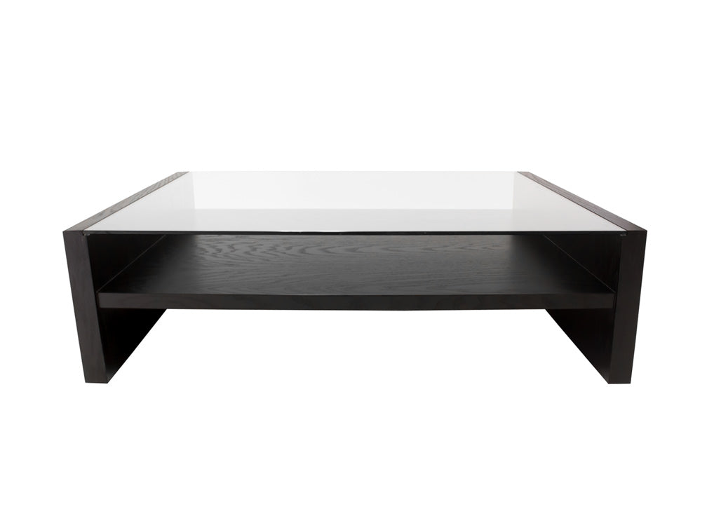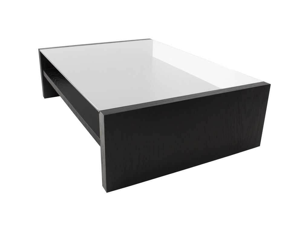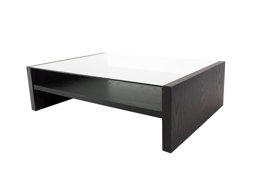 La mesa de centro Kontempo Musta ilustrada es de madera de mdf con enchapado de encino color negro y cubierta de cristal 9 mm con canto pulido brillante.