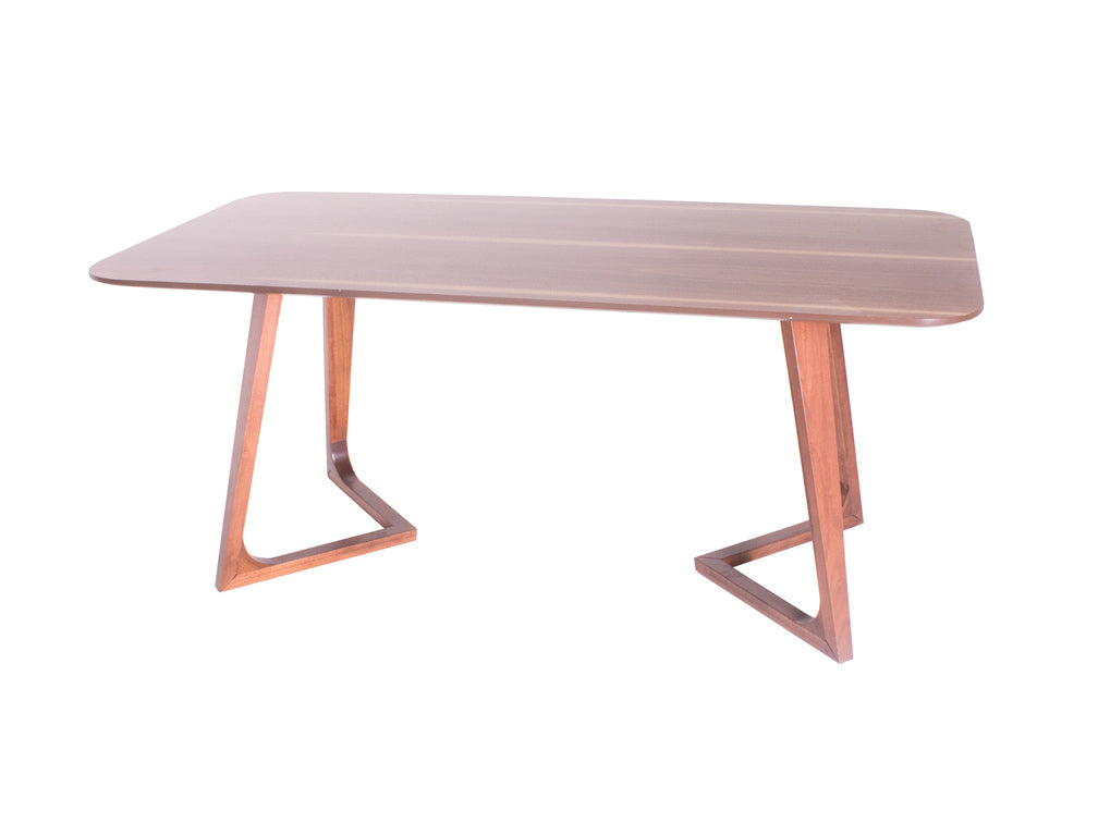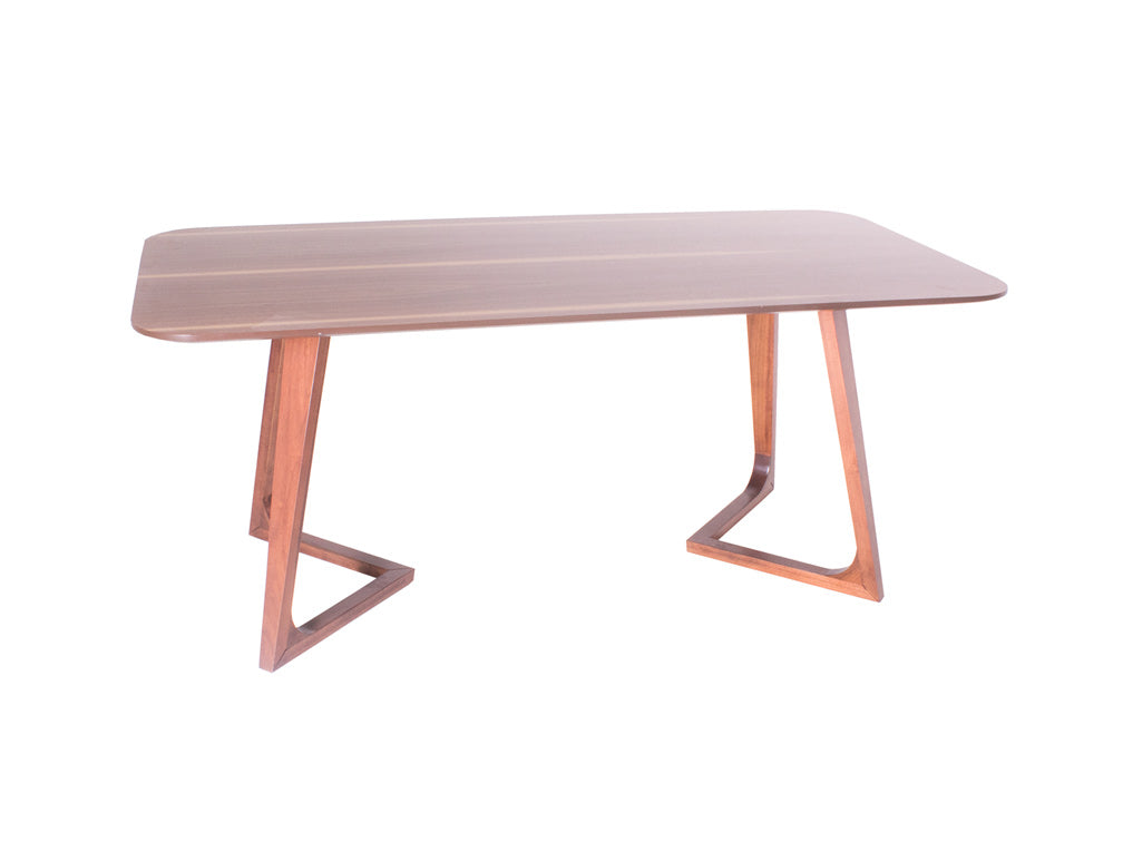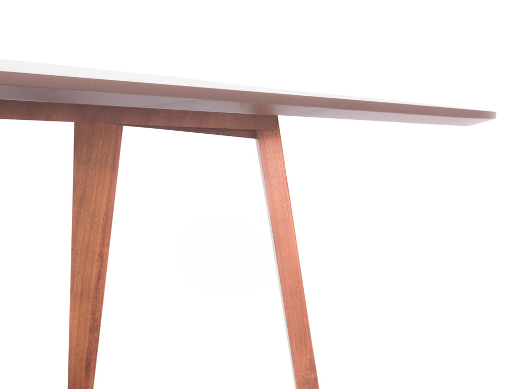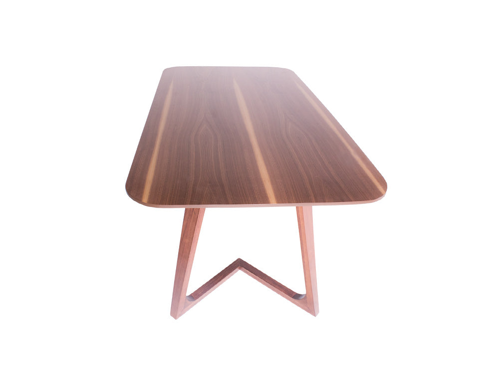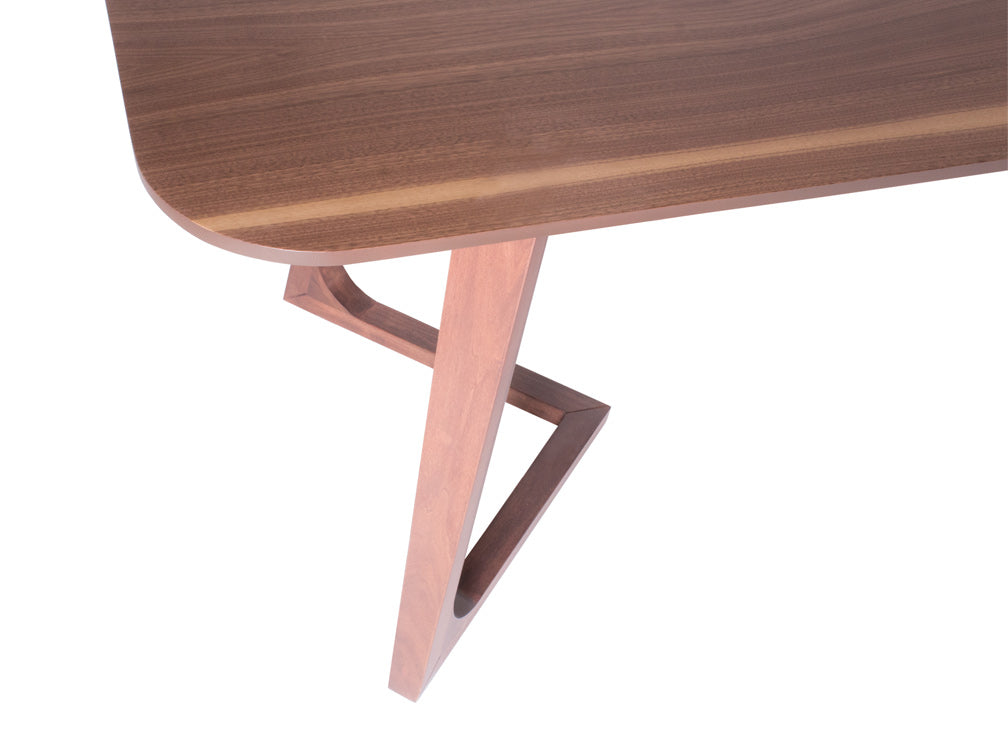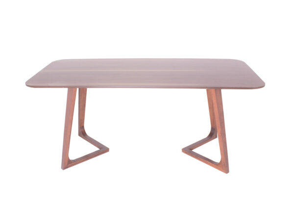 Las patas tienen un diseño de triangulo que va hacia dentro, y las esquinas de la cubierta son redondeadas para moverse con más libertad alrededor de ella.