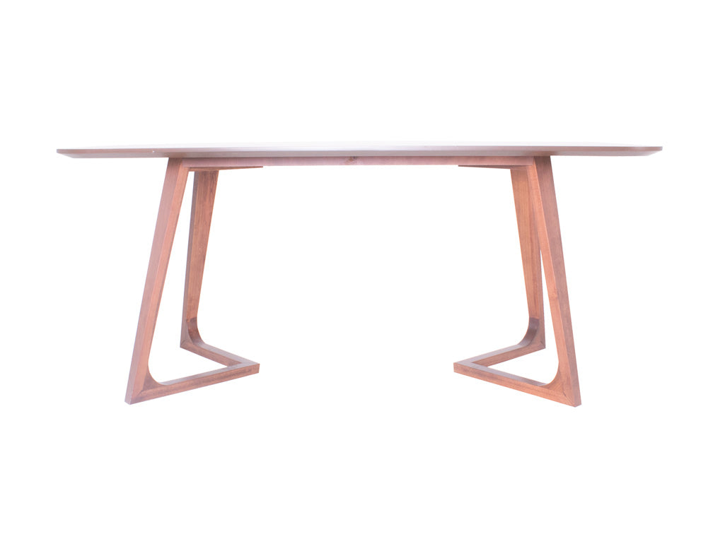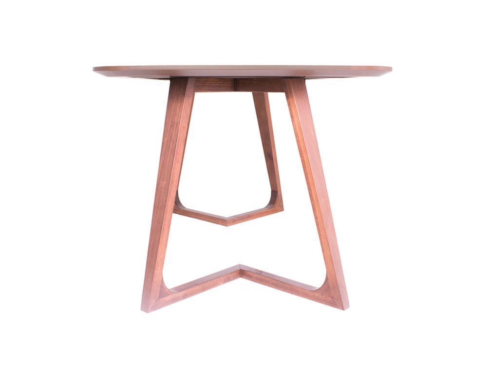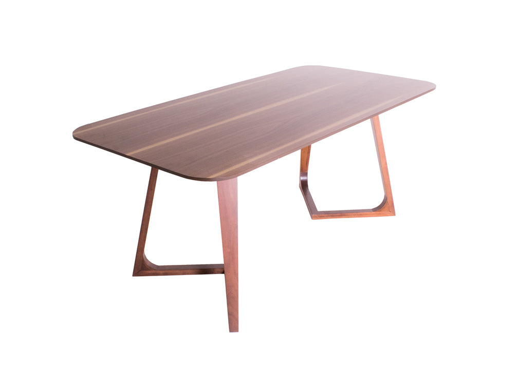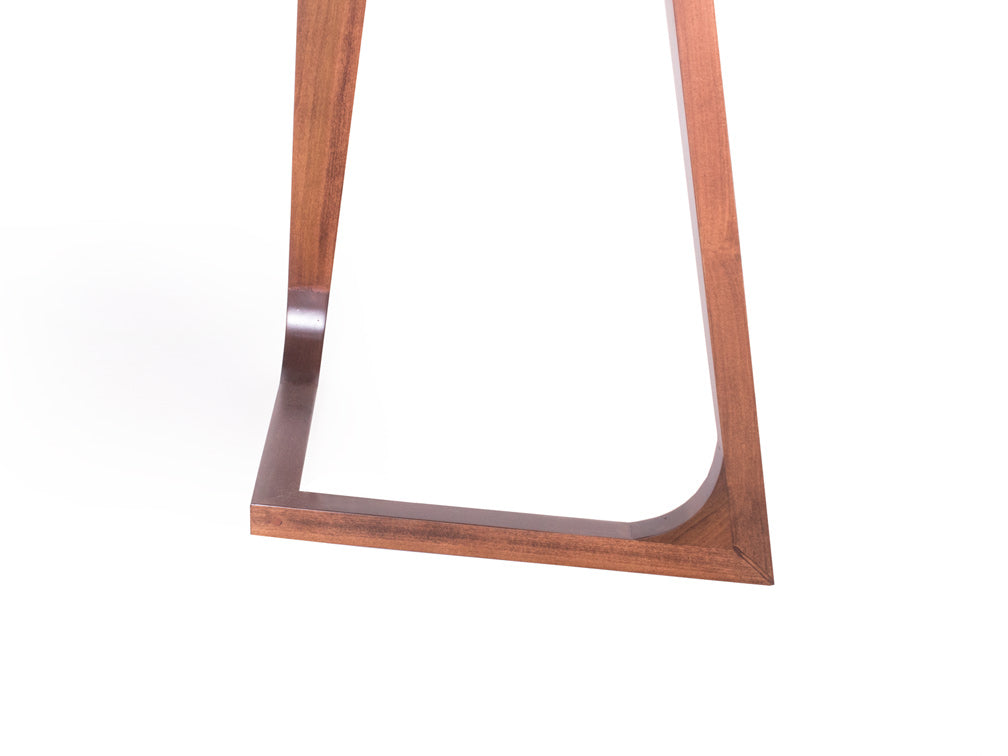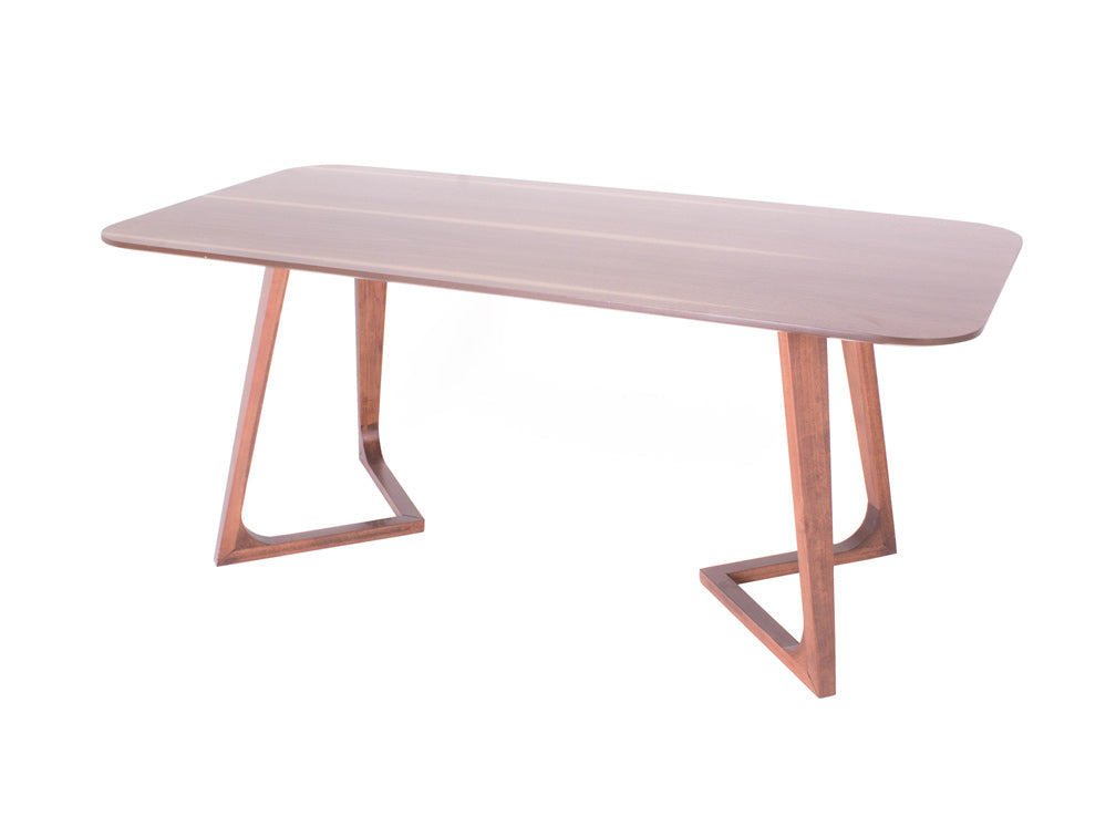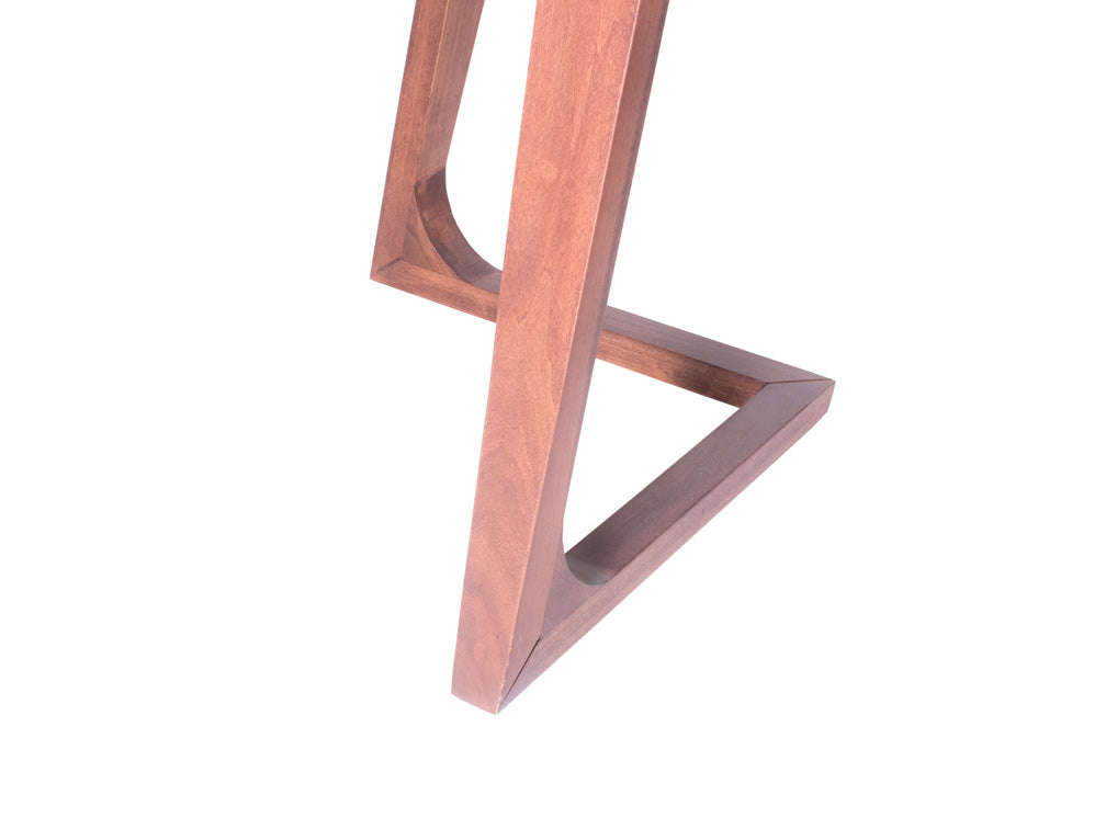 Las patas tienen un diseño de triangulo que va hacia dentro, y las esquinas de la cubierta son redondeadas para moverse con más libertad alrededor de ella.