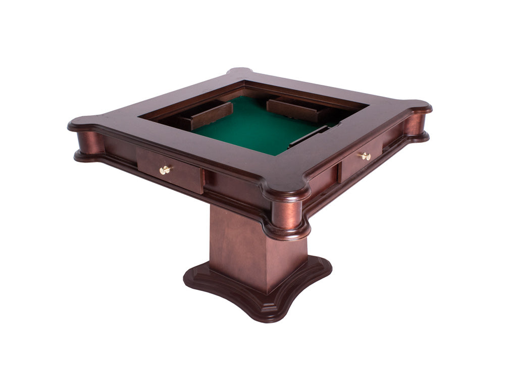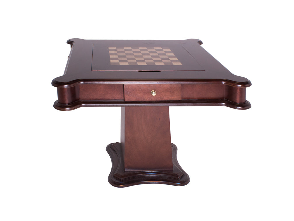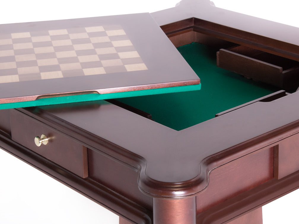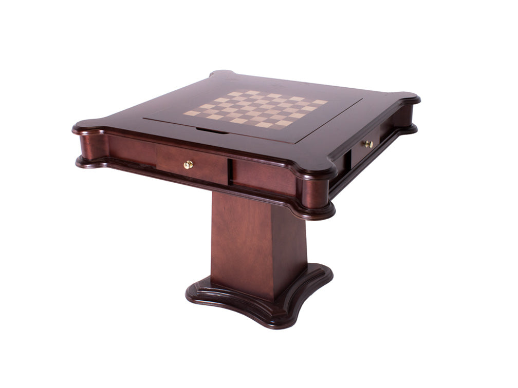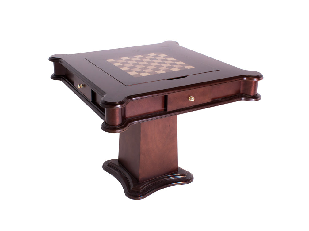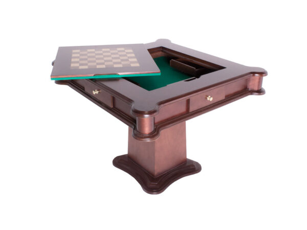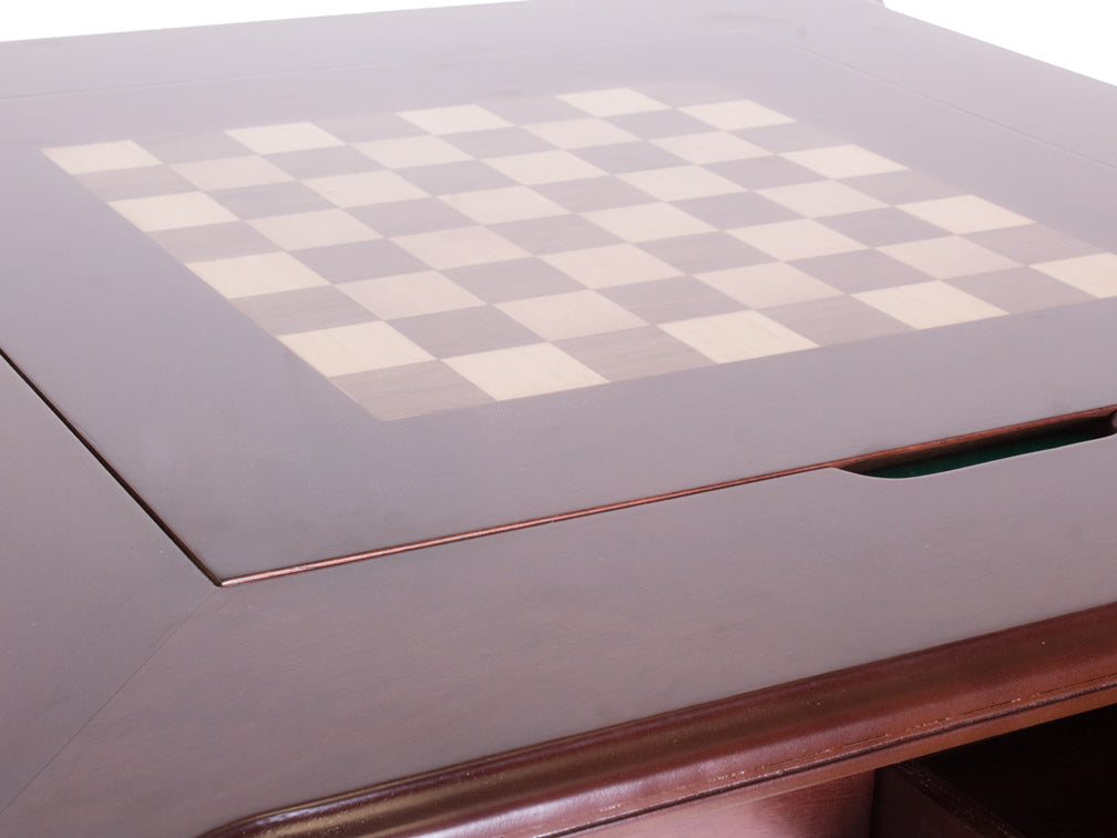 Mesa de juego de ajedrez rematada en las esquinas.Fabricada en MDF chapa encino o caoba color nogal.También se puede fabricar en el color a elegir.Cuenta con paño verde en el centro y archivo.Así como también cuenta con una tapa que cubre la parte central y es reversible.Cuenta con unas medidas de 98 centímetros de largo, por 98 centímetros de ancho y 78 centímetros de altura.