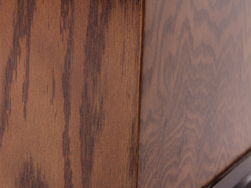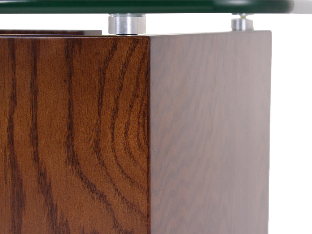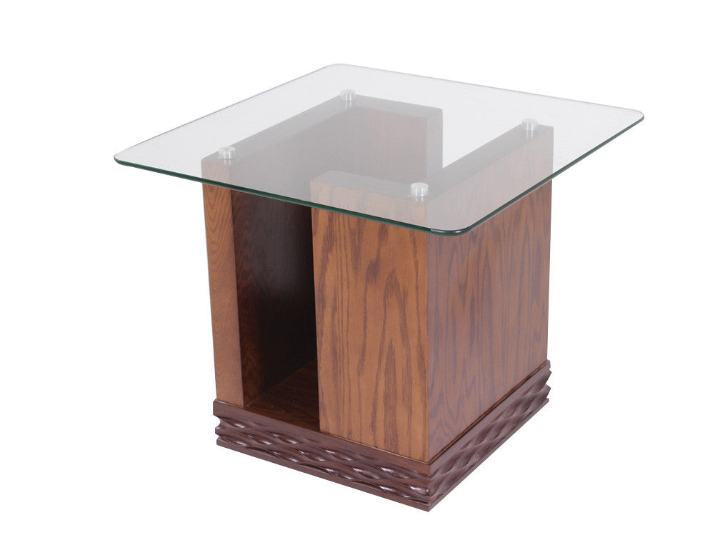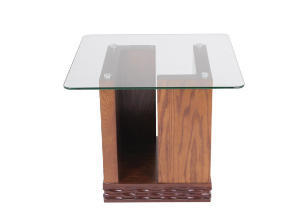 Mesa lateral moderna fabricada en MDF y enchapado de encino disponible en color nogal, tabaco, chocolate, gris y blanco. Esta mesa lateral cuenta con detalles de poliuretano.