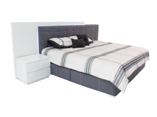 La base Kontempo RC – 76 es de madera de poplar con tapiz BT Mia Collection en color blue stone y el buró es de madera de mdf en color blanco mate.