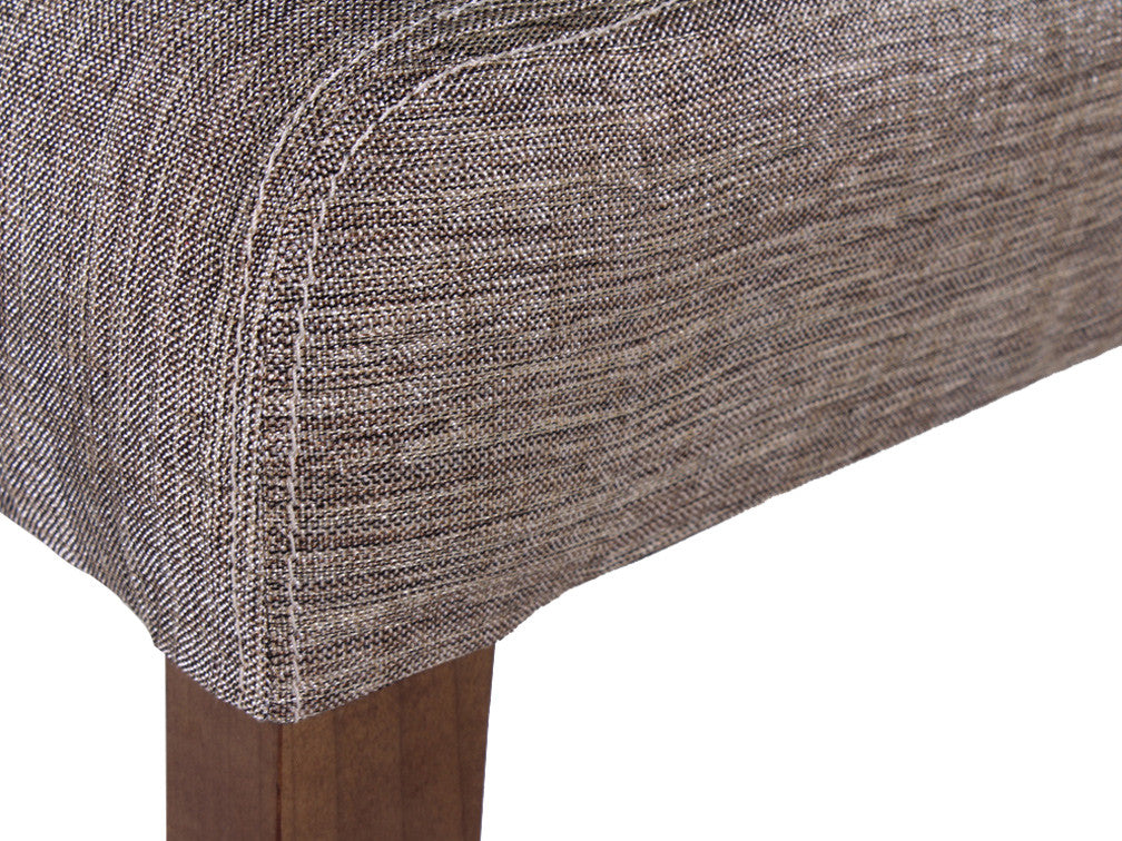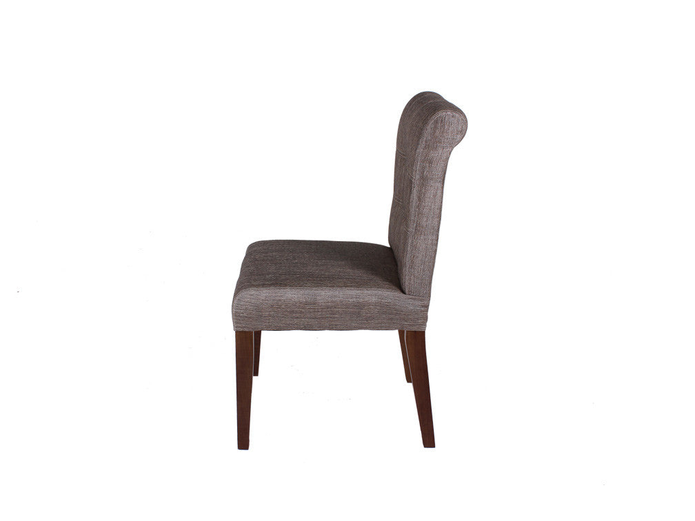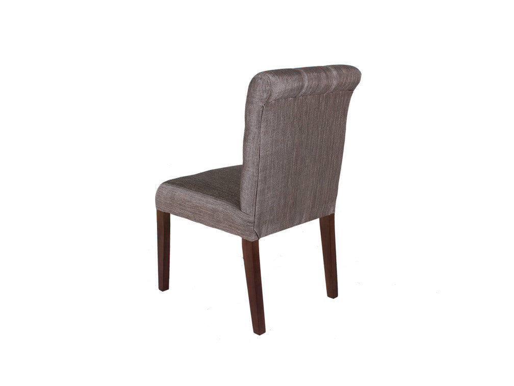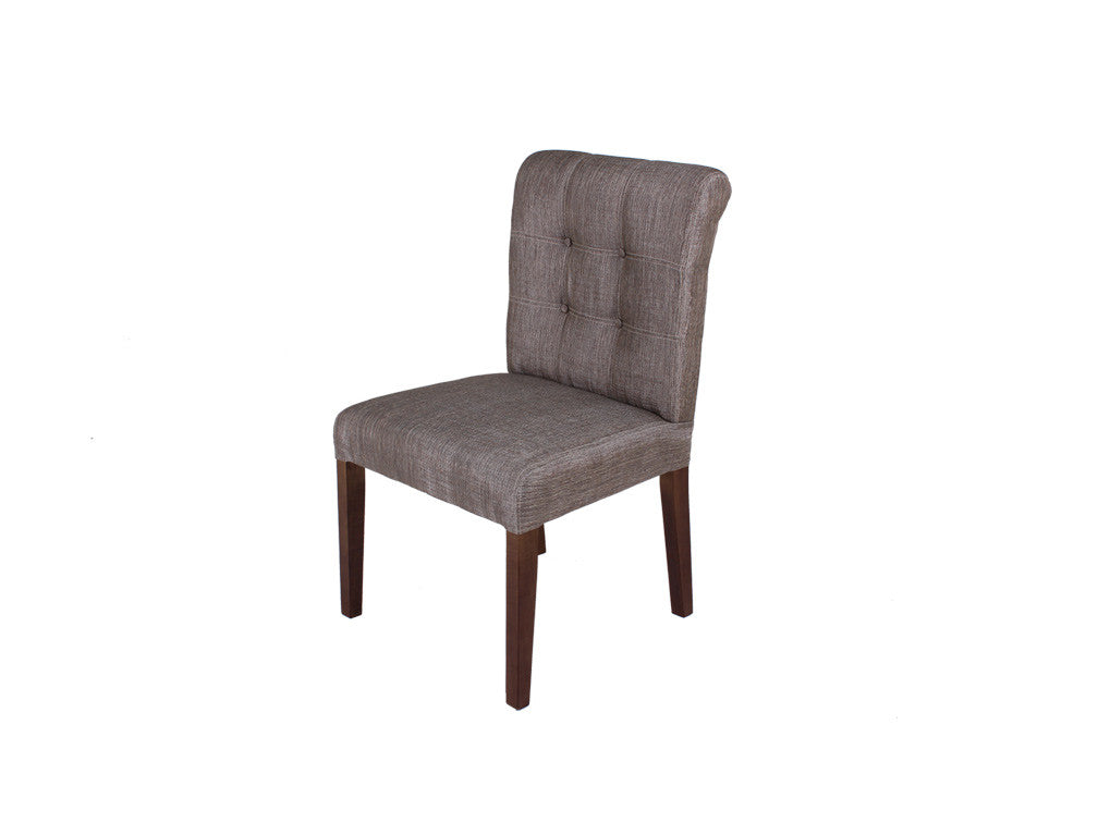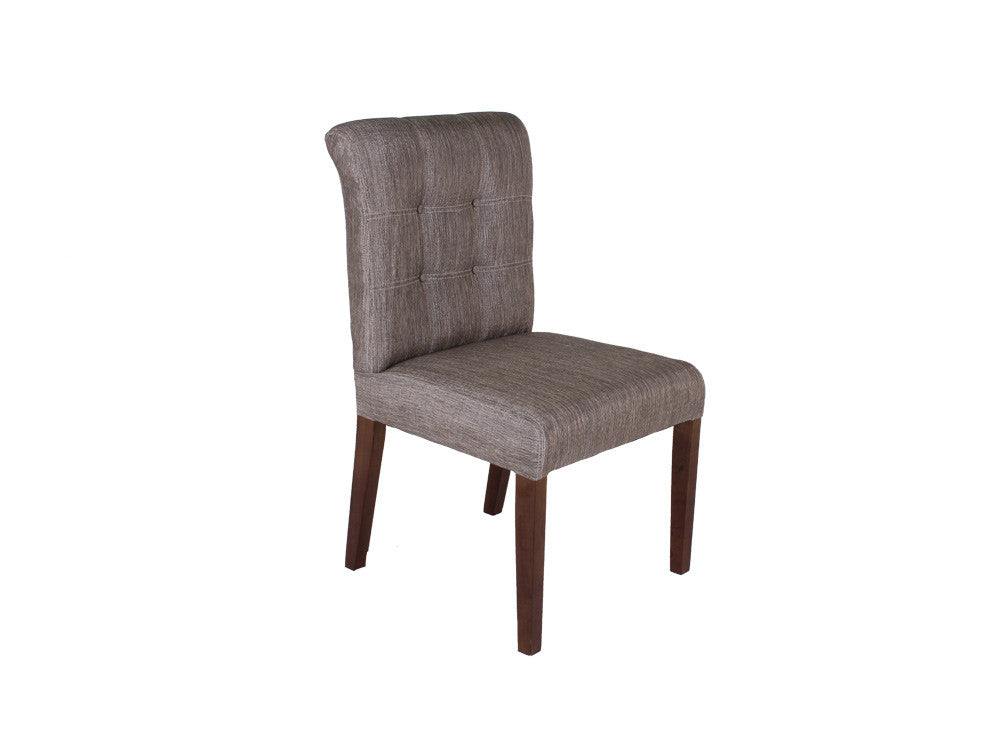 Silla contemporánea de cómodo y amplio diseño con copete y punteado en respaldo. Fabricada en madera de pino y poplar. Con opción de tapizado en tela o tactopiel.