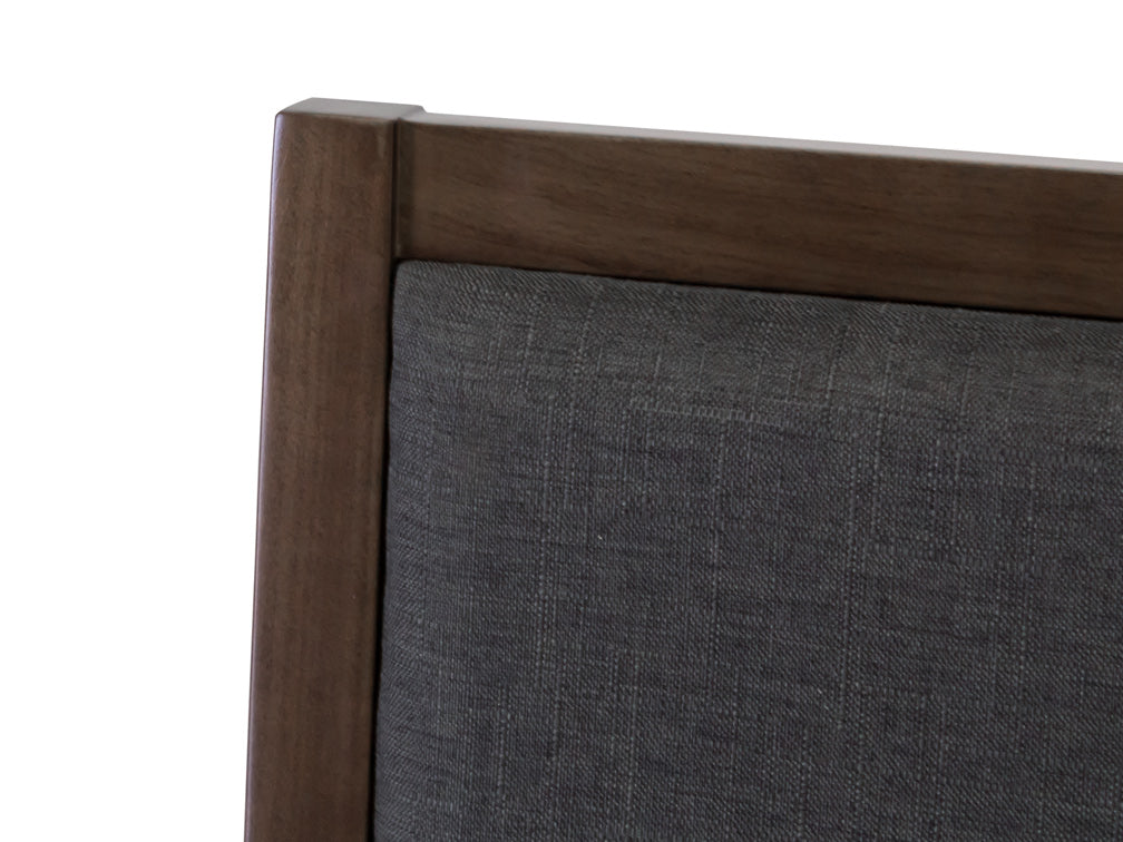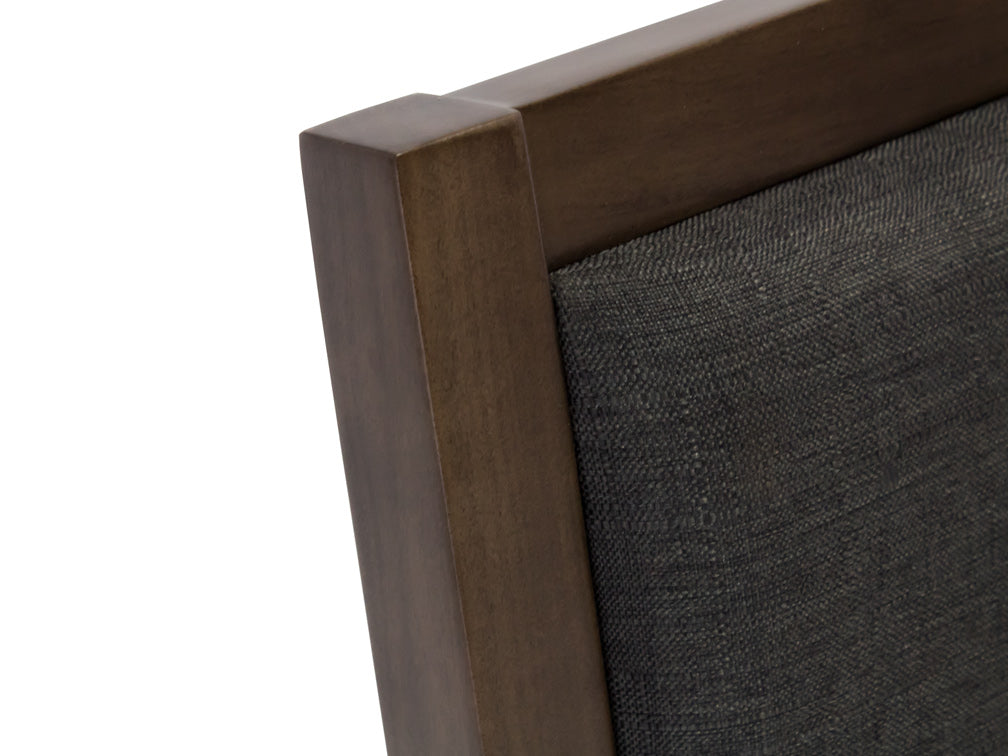 Esta silla para comedor ilustrada Kontempo Arenas es de madera de pino y álamo en color nogal, y tapiz de tela Vila Mineral en color verde.
