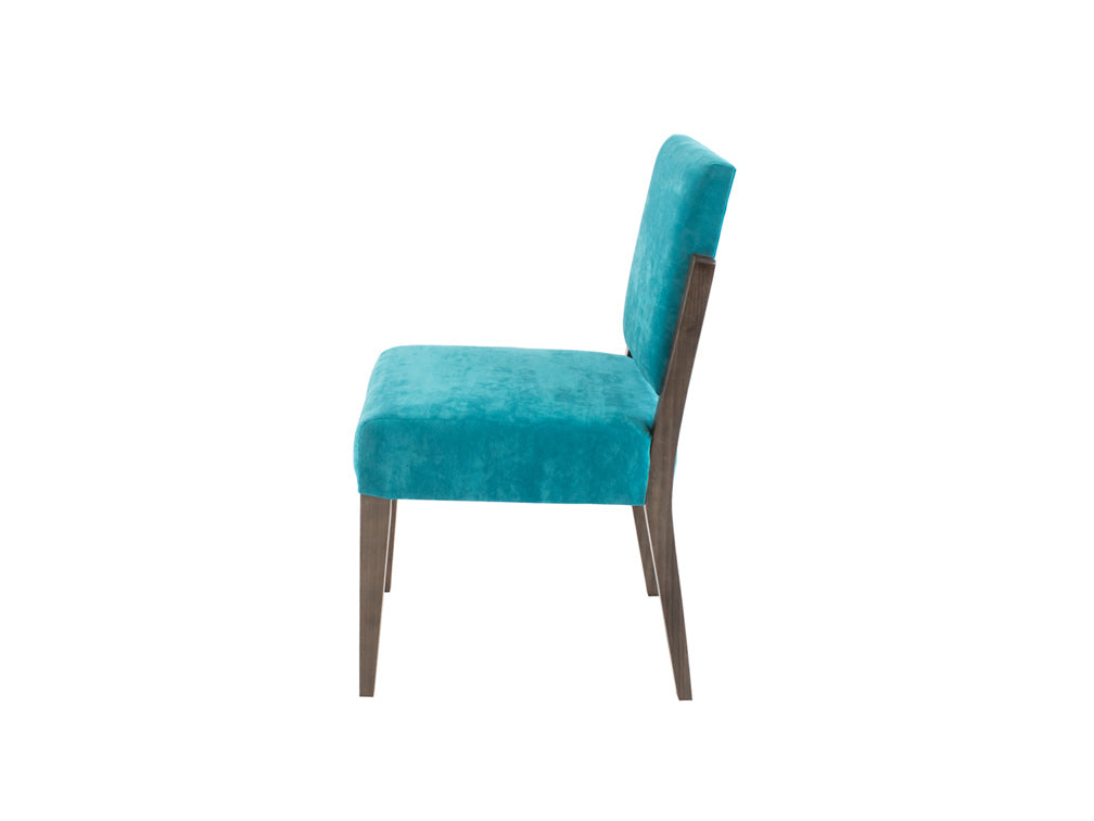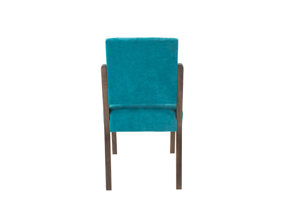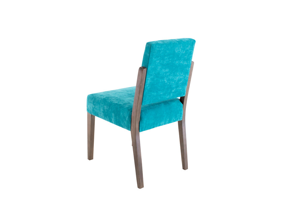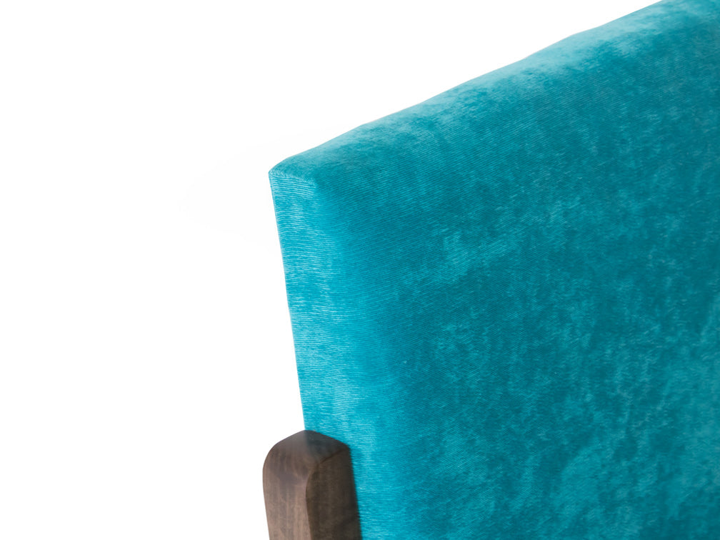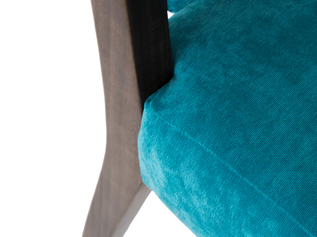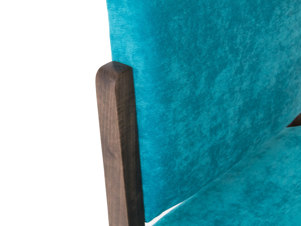 Esta silla es de madera de poplar en color nogal y tapiz de suede en color aqua.