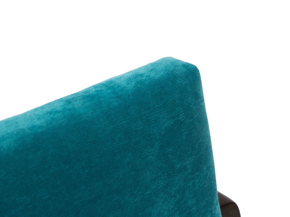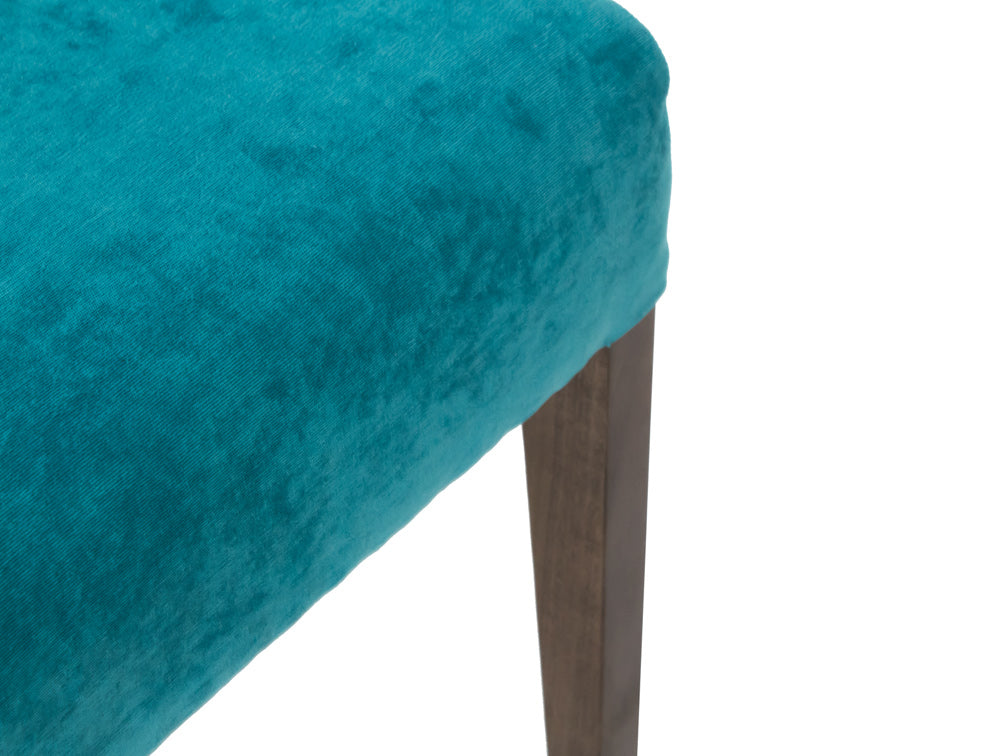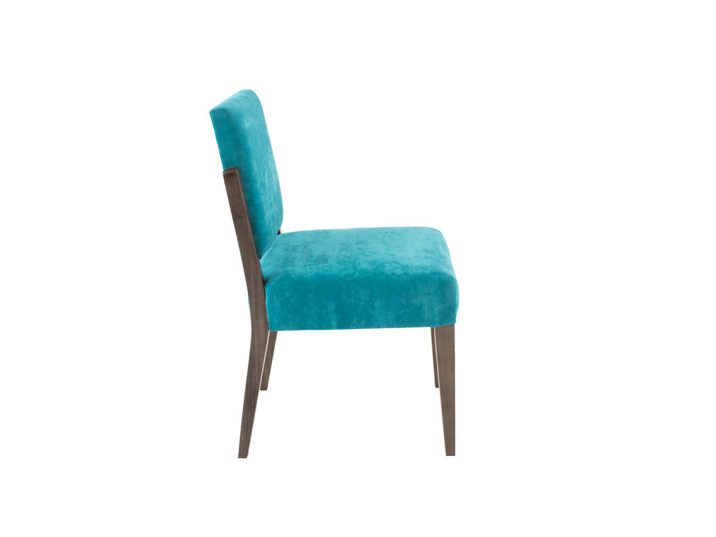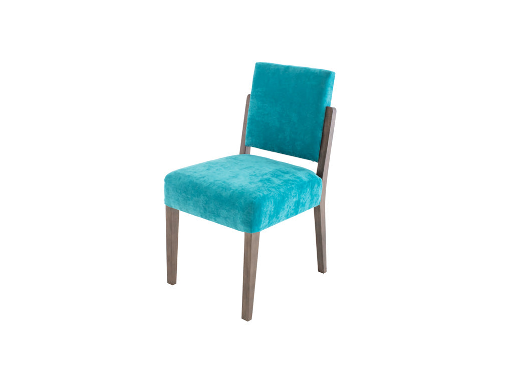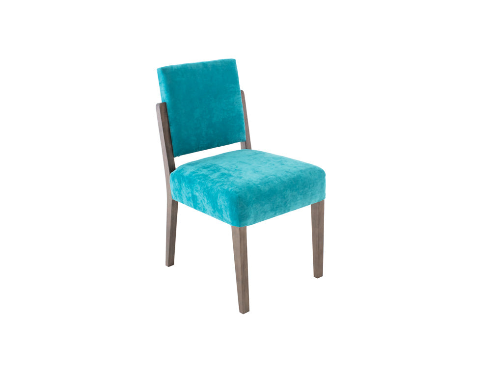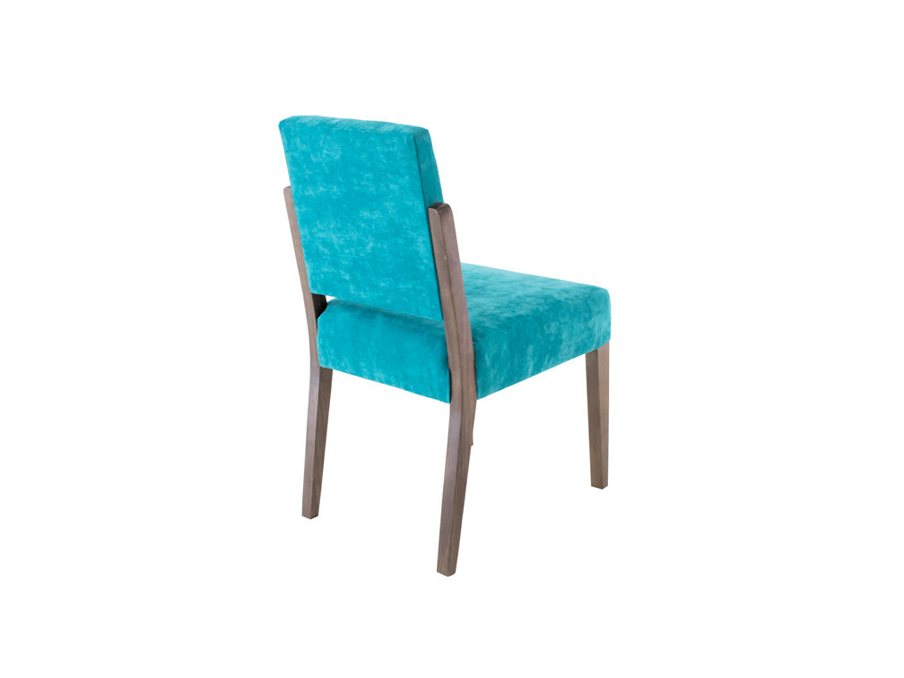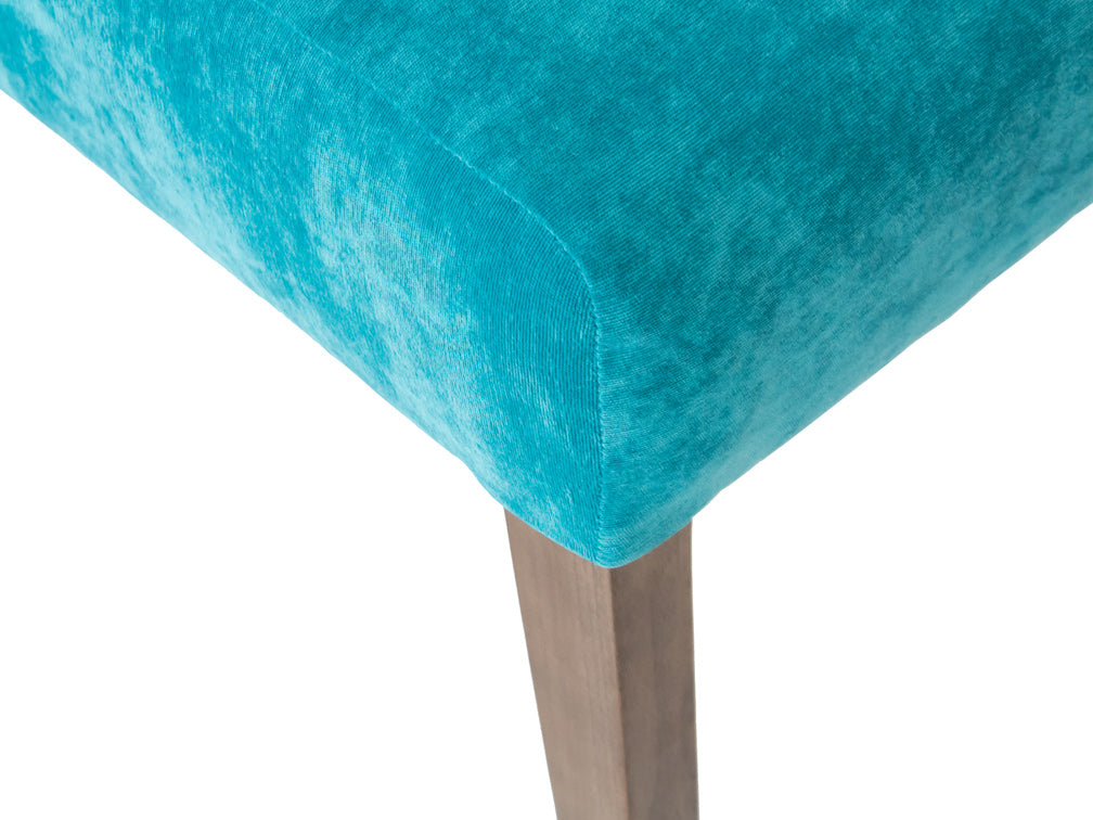Esta silla es de madera de poplar en color nogal y tapiz de suede en color aqua.